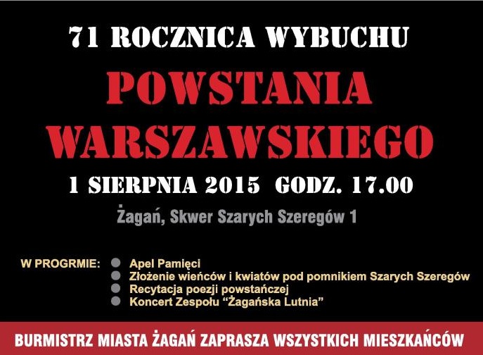 Dzień ten upamiętnimy Apelem Pamięci, recytacją poezji powstańczej oraz występem zespołu “Lutnia”. Uroczystość odbędzie się przy udziale kompanii honorowej 11. Batalionu Dowodzenia. Informujemy również, że zgodnie z decyzją Wojewody Lubuskiego, w dniu 1 sierpnia 2015 roku o godzinie 17.00 dla uczczenia 71 rocznicy wybuchu Powstania Warszawskiego w mieście Żagań zostaną uruchomione syreny alarmowe Centralnego Systemu Alarmowania i Ostrzegania Obrony Cywilnej, nadając ciągły dźwięk trwający 1 minutę.
