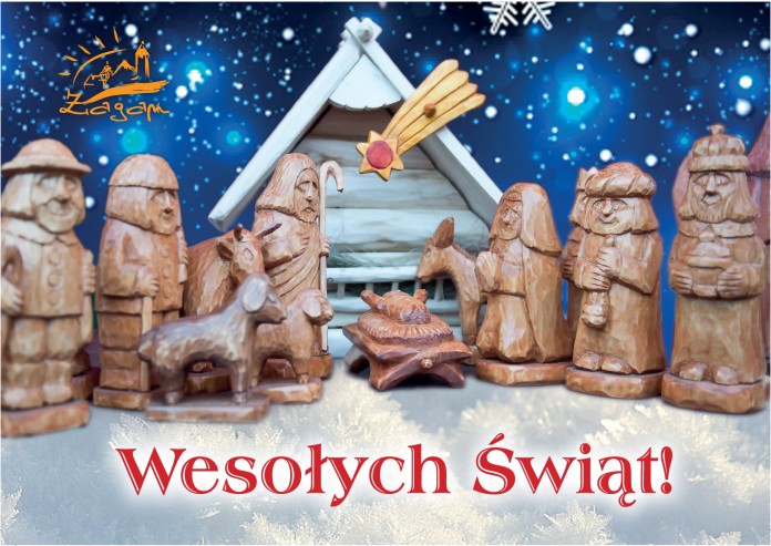 Tegoroczna kartka świąteczna przedstawia szopkę bożonarodzeniową wyrzeźbioną przez Jerzego Kupczyka.