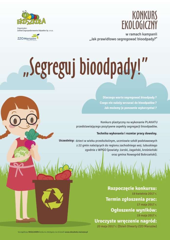 Zapraszamy dzieci uczęszczające do przedszkoli i szkół podstawowych do wzięcia udziału w konkursie ekologicznym “Segreguj bioodpady” organizowanym przez Zakład Zagospodarowania Odpadów w Marszowie. W ramach konkursu uczniowie mają za zadanie stworzyć indywidualną pracę plastyczną (plakat), przedstawiającą pozytywne aspekty segregacji bioodpadów.