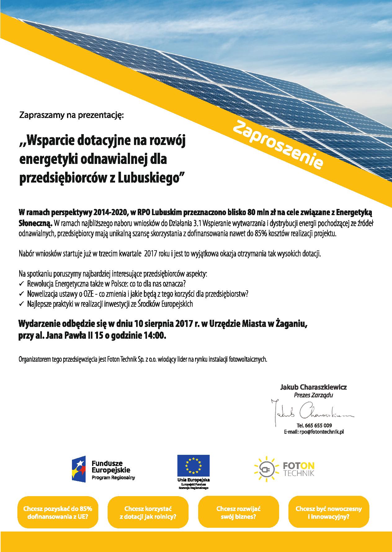 Przedsiębiorców zainteresowanych otrzymaniem dotacji na rozwój energetyki odnawialnej zapraszamy na spotkanie. 10 sierpnia 2017 roku o godzinie 14.00 w pałacyku przy ul. Jana Pawła II 15 specjaliści z zakresu fotowoltaiki opowiedzą o możliwościach, jakie daje nowa technologia oraz sposobach wsparcia i możliwościach dofinansowania tego typu przedsięwzięć.