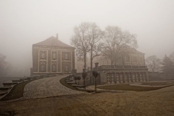 Pałac Książęcy w Żaganiu we mgle.