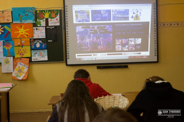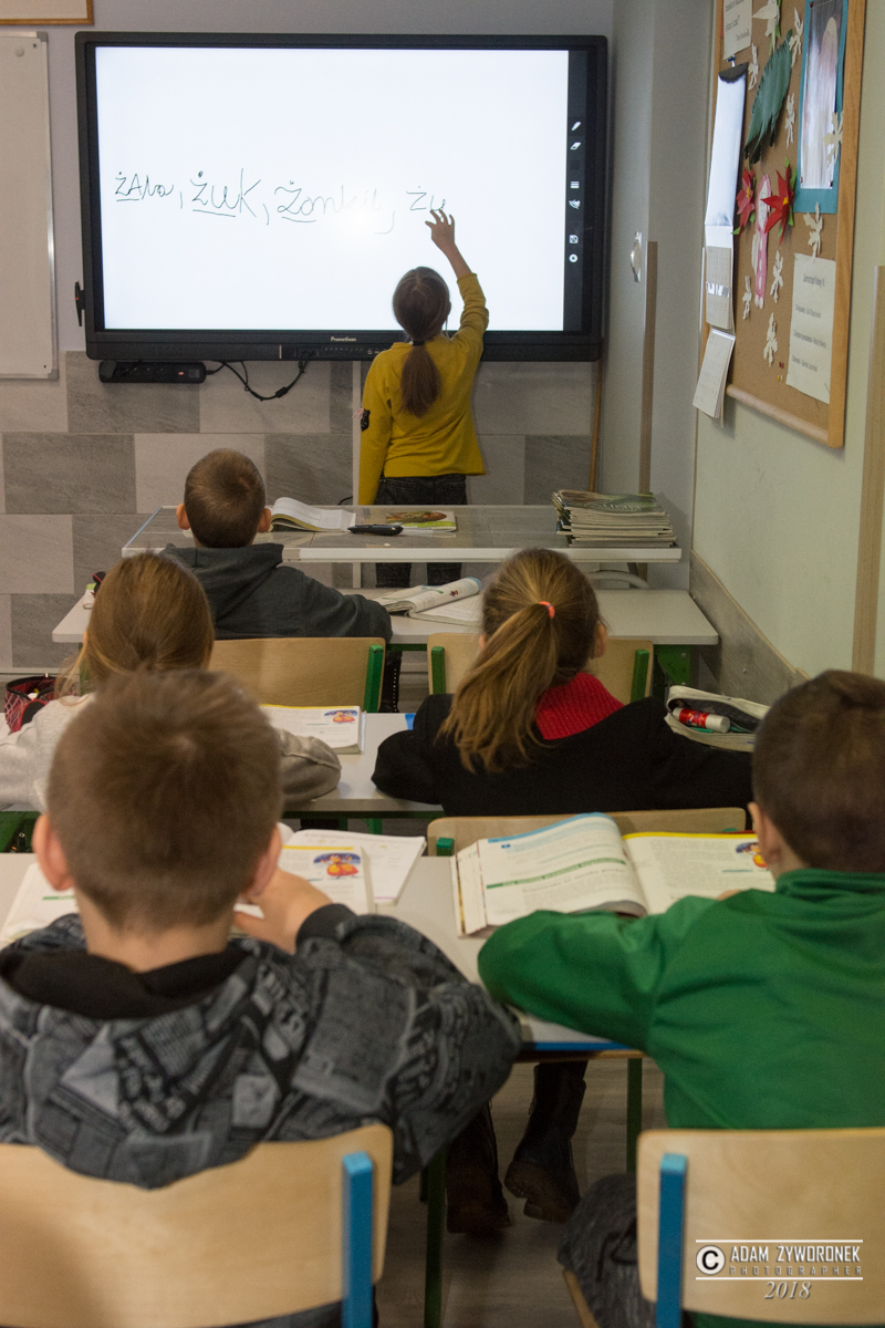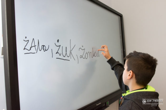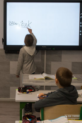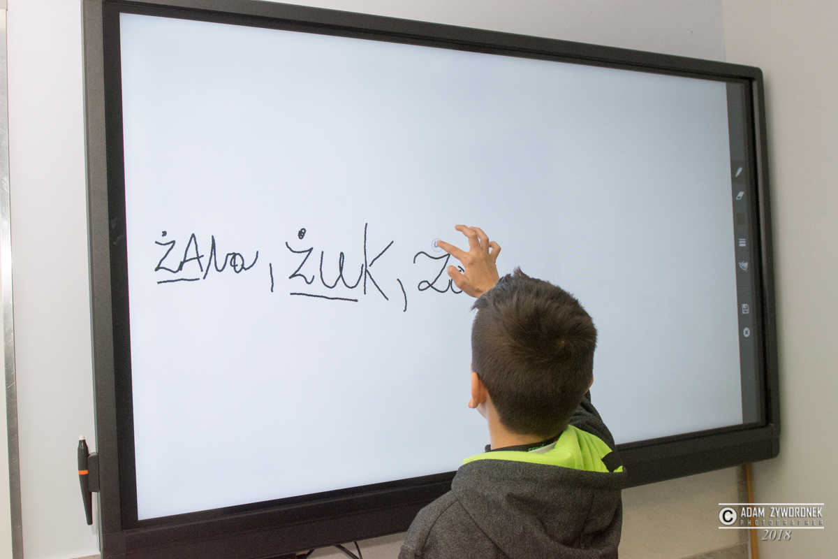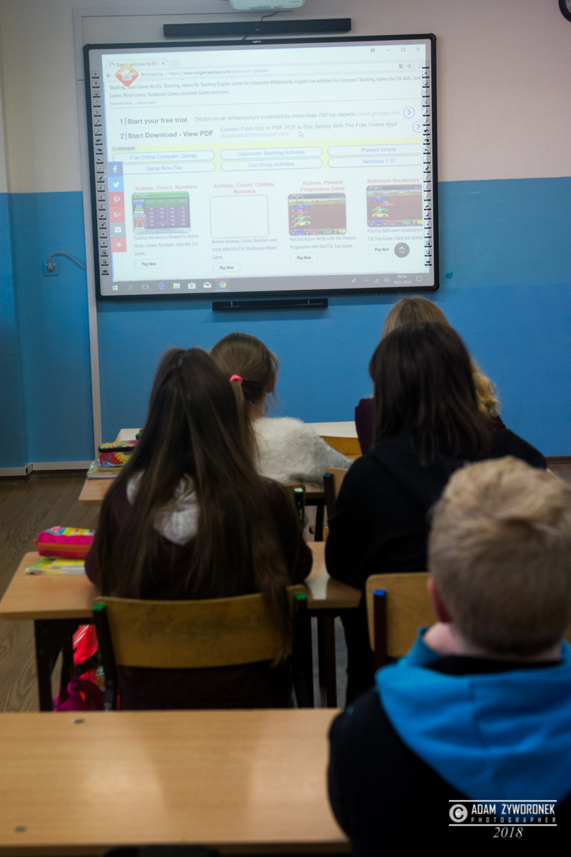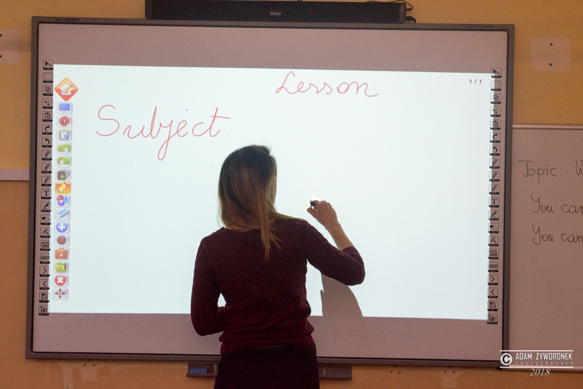 Kacper Reszka z klasy Vb, podczas zajęć z języka angielskiego z panią Gabrielą Klessą  zaznacza, że z pomocą tablic łatwiej uczyć się języków. – Oglądamy filmy, słuchamy piosenek – stwierdza.