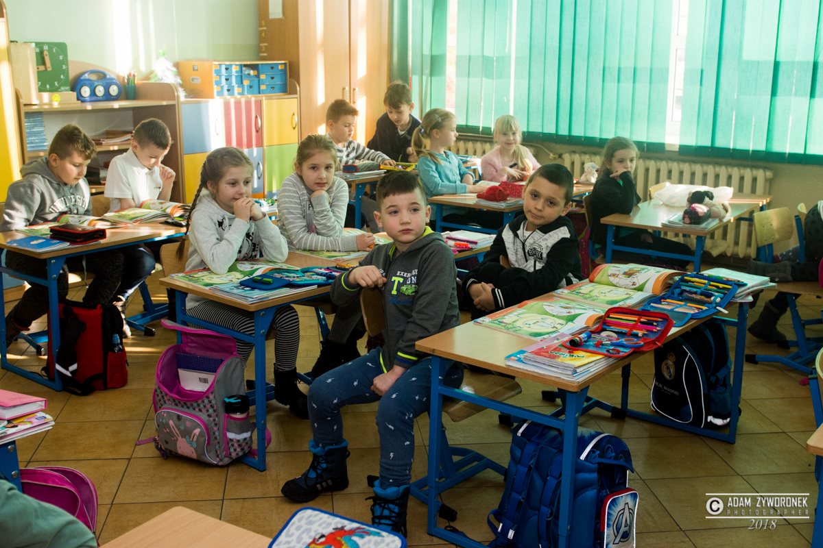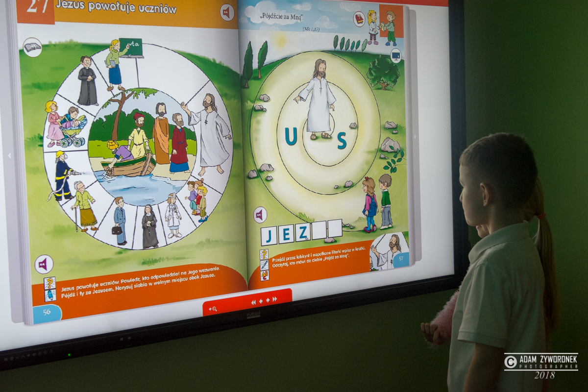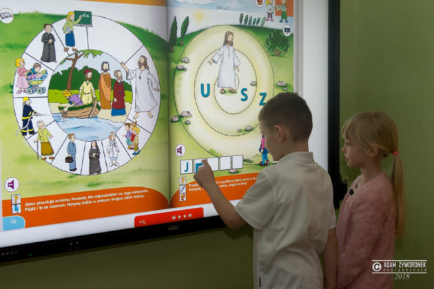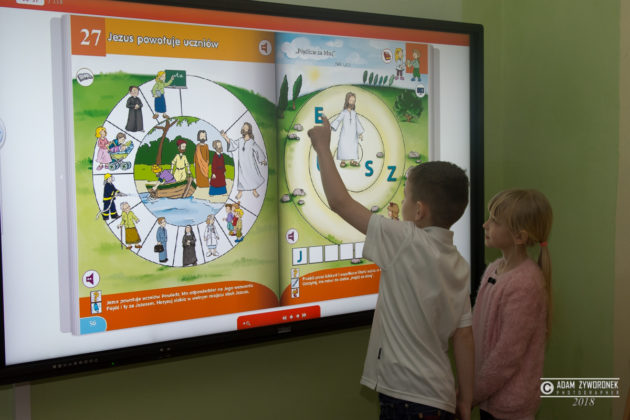 Najnowszym nabytkiem w PSP 7 jest ogromny, 74 calowy monitor interaktywny. Trafiliśmy na lekcje religii dla klasy  I c z panem Tomaszem Barnasiem. Na ekranie pan wyświetlił podręcznik z ciekawymi, interaktywnymi krzyżówkami dla maluchów. – W sumie mamy ponad 20 sprzętów w postaci tablic, projektorów, itp. – uściśla Dorota Stebelska, dyrektor PSP 7 przy ul. Żarskiej. To bardzo ułatwia prowadzenie zajęć.