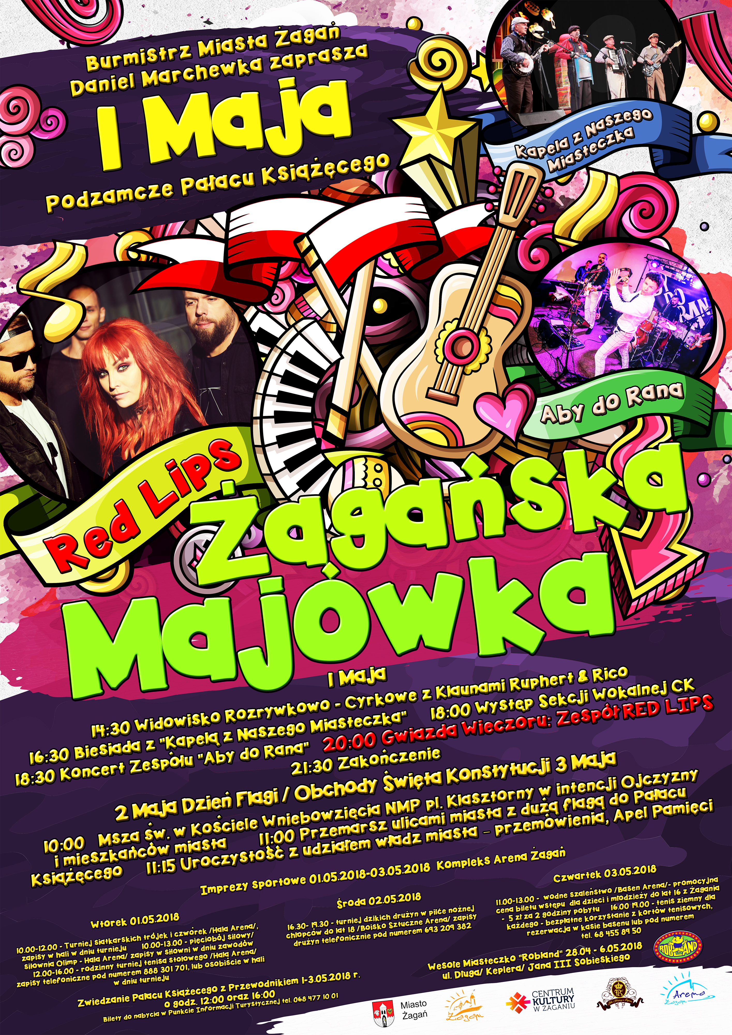 Wtorek 1 maja, podzamcze Pałacu Książęcego: 14.30 widowisko rozrywkowo-cyrkowe z klaunami Ruphertem & Rico, 16.30 biesiada z „Kapelą z Naszego Miasteczka”, 18.00 zespół „Aby do Rana”. W przerwie koncertu występ solistów z sekcji wokalnej Szkoły Talentów Centrum Kultury w Żaganiu.