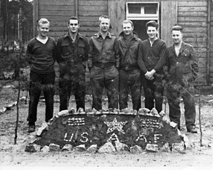 Wayne Gotke drugi od lewej. Zdjęcie wykonane w sektorze północnym Stalagu Luft 3 w 1943 roku.