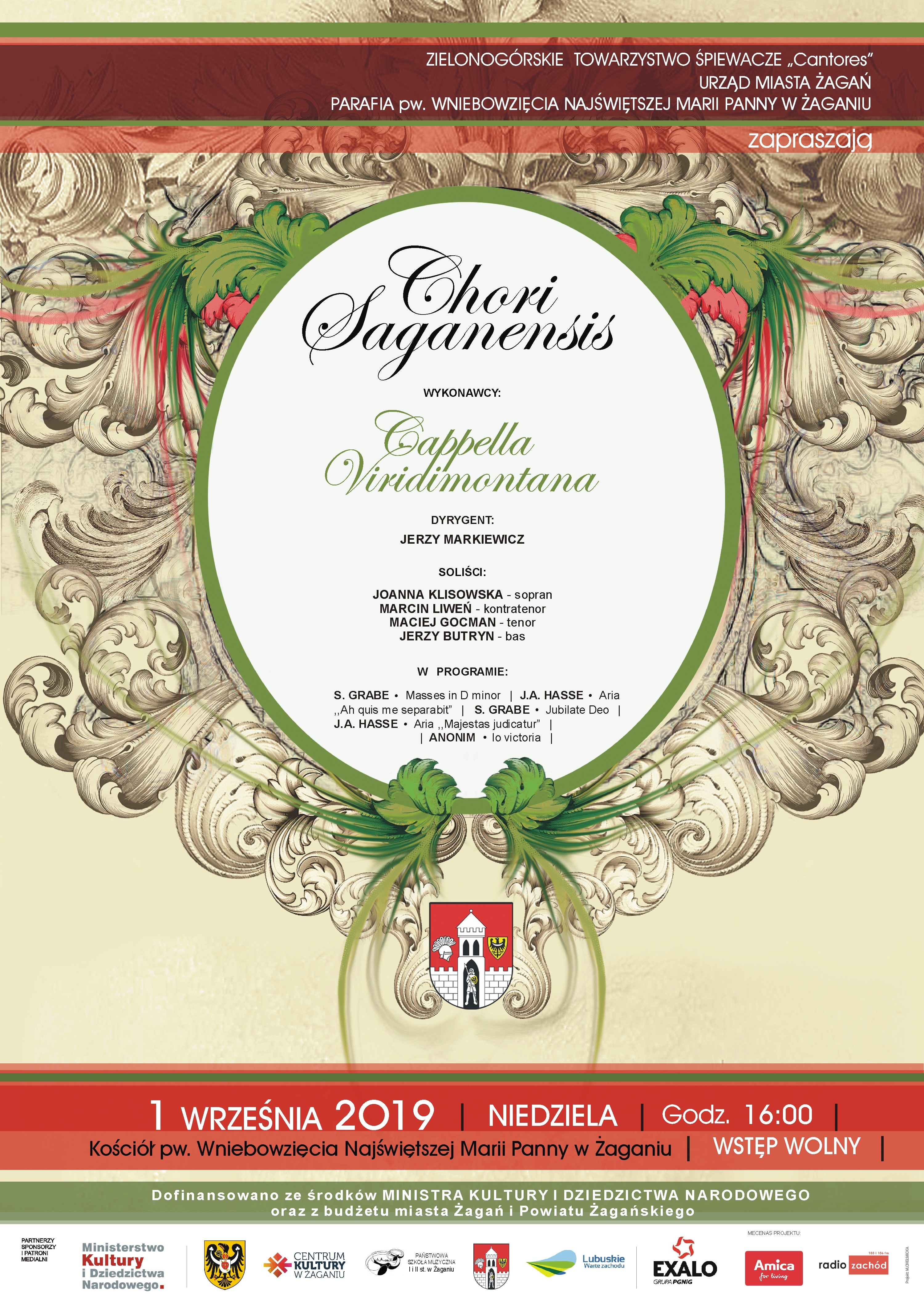 Zapraszamy 1 września 2019 o godz. 16.00 na niezwykły koncert. W kościele pw. Wniebowzięcia Najświętszej Marii Panny wystąpią soliści oraz Cappella Viridimontana (zespół specjalizujący się w wykonawstwie muzyki dawnej zgodnie z historyczną praktyką wykonawczą) pod dyrekcją Jerzego Markiewicza.