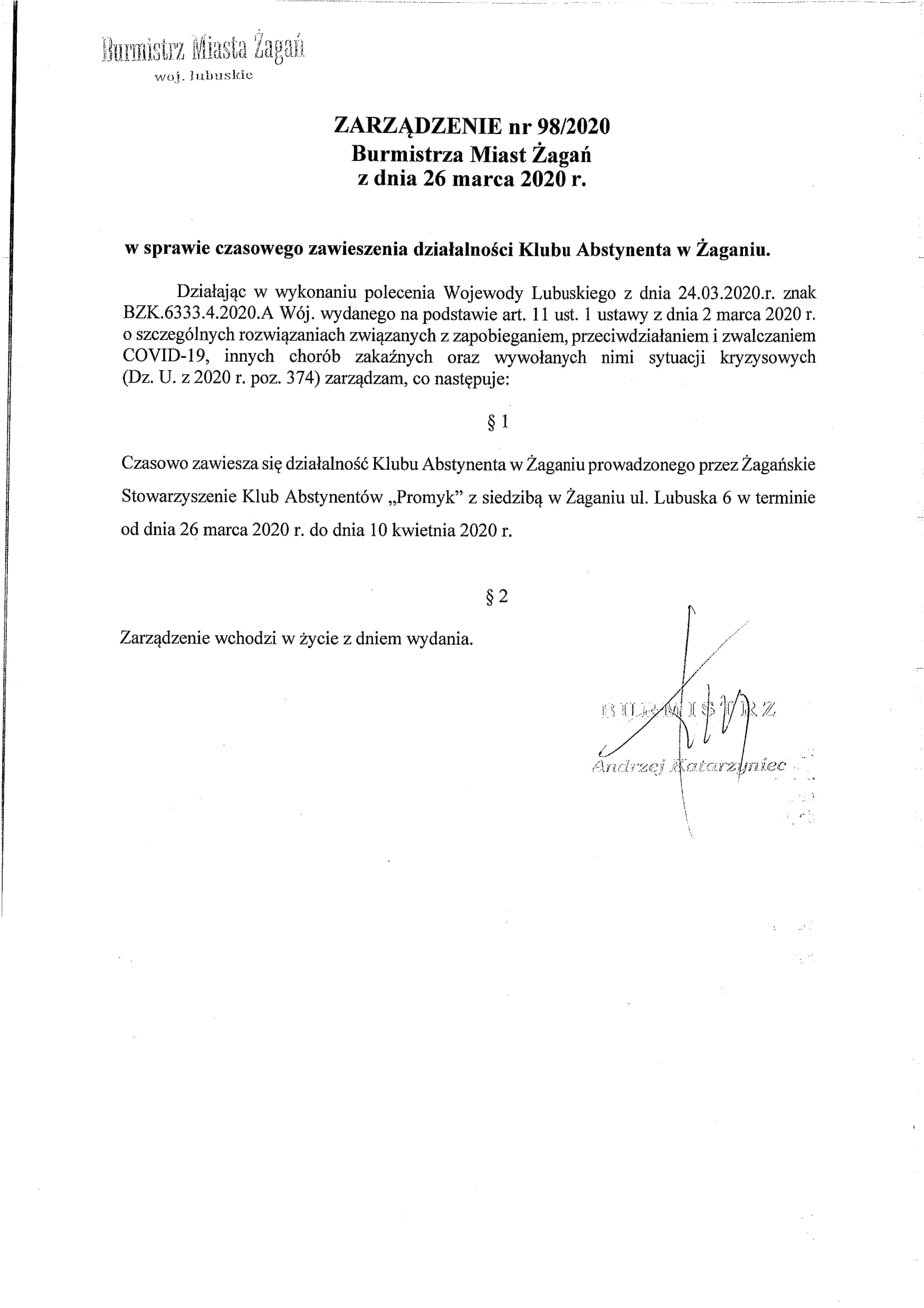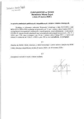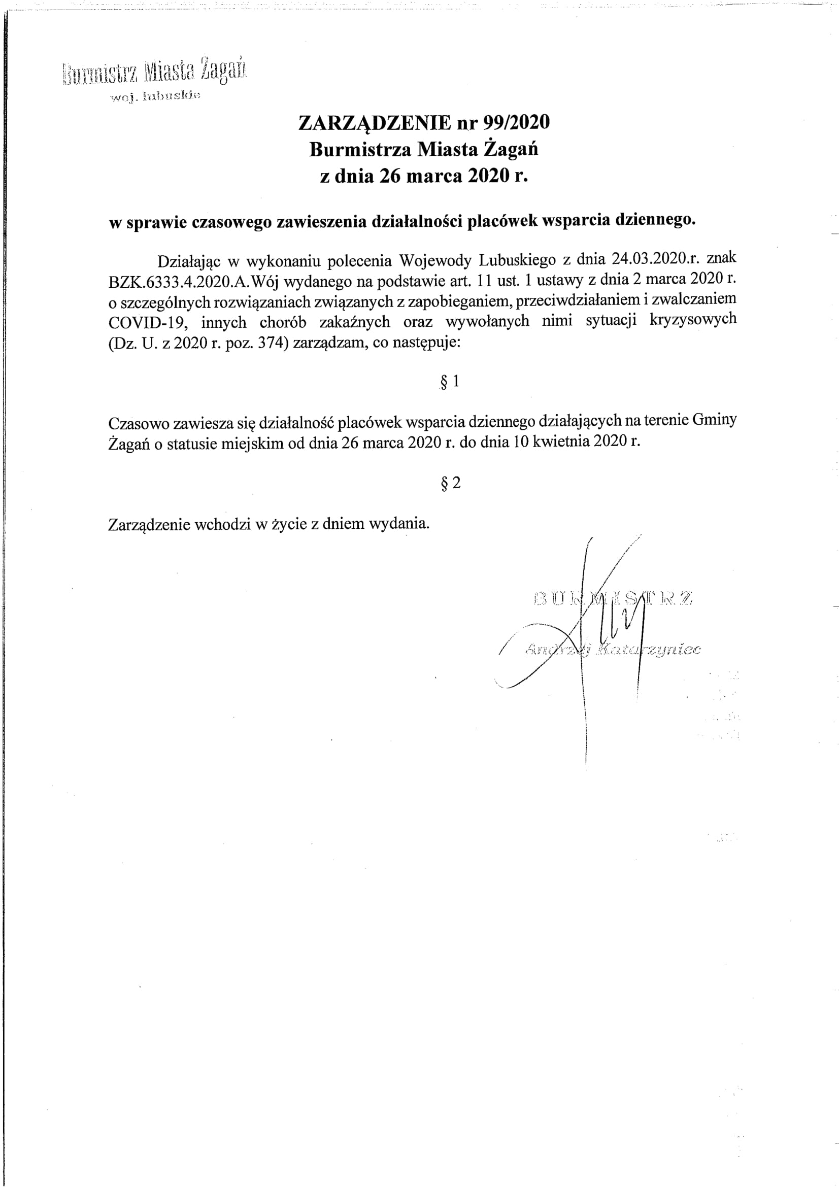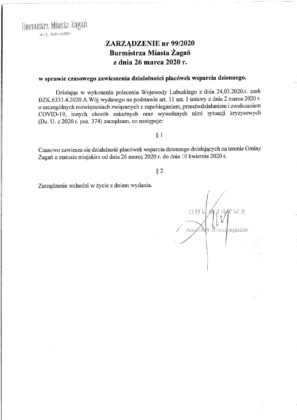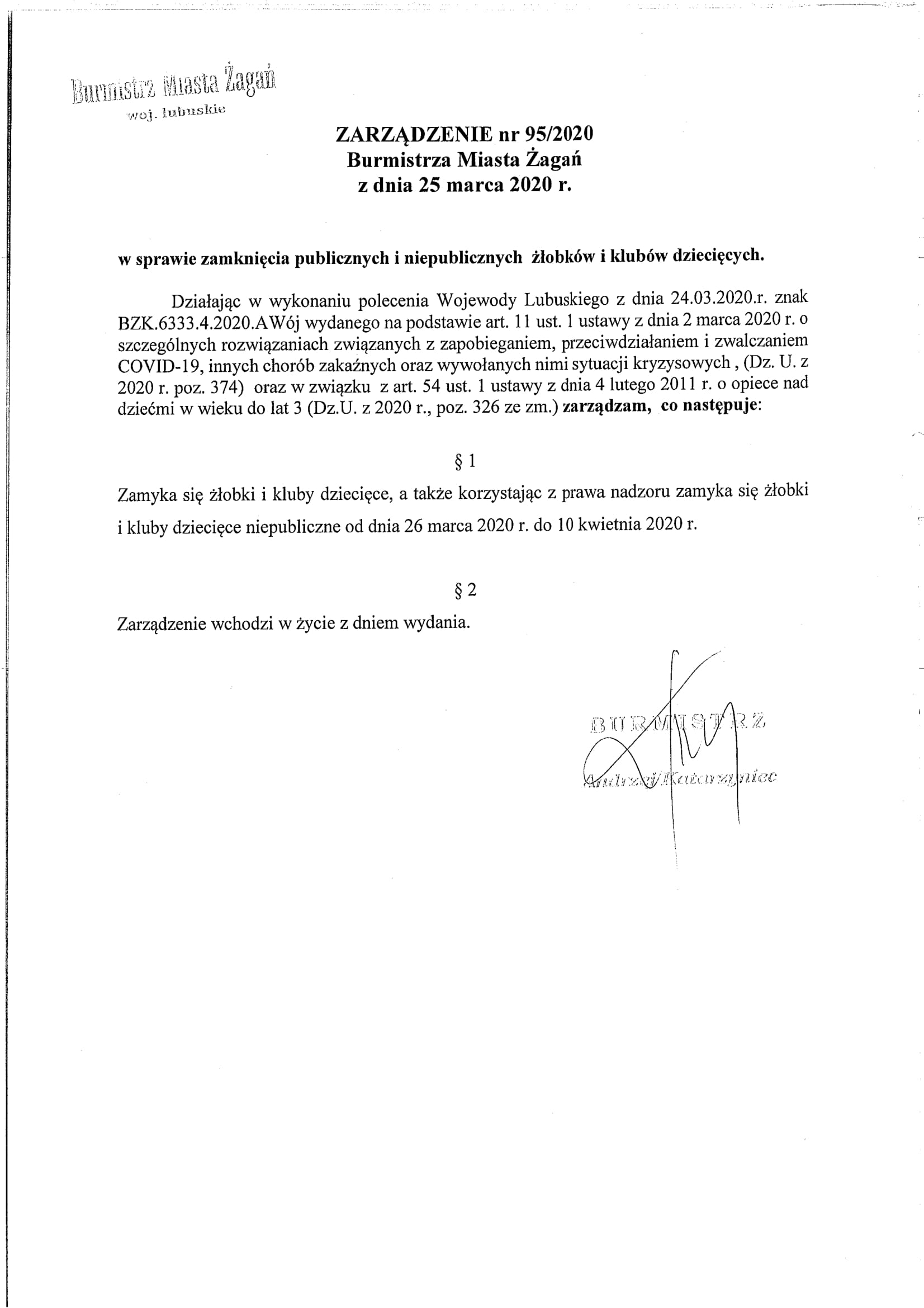 Publikujemy zarządzenia Burmistrza Miasta Żagań dotyczące funkcjonowania miejskich placówek oświatowych wprowadzone zgodnie z zaleceniami Wojewody Lubuskiego. Zgodnie z zarządzeniami do 10 kwietnia, podobnie jak szkoły i przedszkola, zamknięte pozostają żłobki niepubliczne i kluby dziecięce, klub abstynenta oraz placówki wsparcia dziennego.