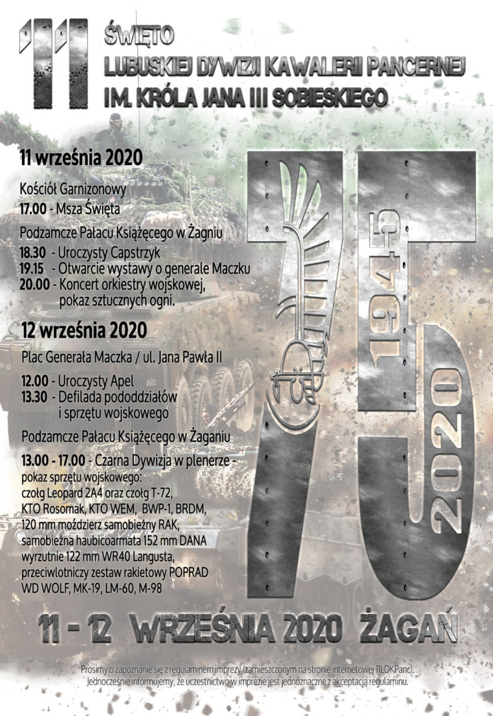 Jednocześnie miłośników sprzętu wojskowego i pasjonatów militariów zapraszamy na błonia żagańskiego Pałacu Książęcego, gdzie będą mogli uczestniczyć w pikniku militarnym „Czarna Dywizja w plenerze”. W czasie pikniku każdy znajdzie coś dla siebie, od smacznej żołnierskiej grochówki i wypiekanego wojskowego czarnego chleba, aż po możliwość obejrzenia z bliska sprzętu wojskowego.ów pieszych.