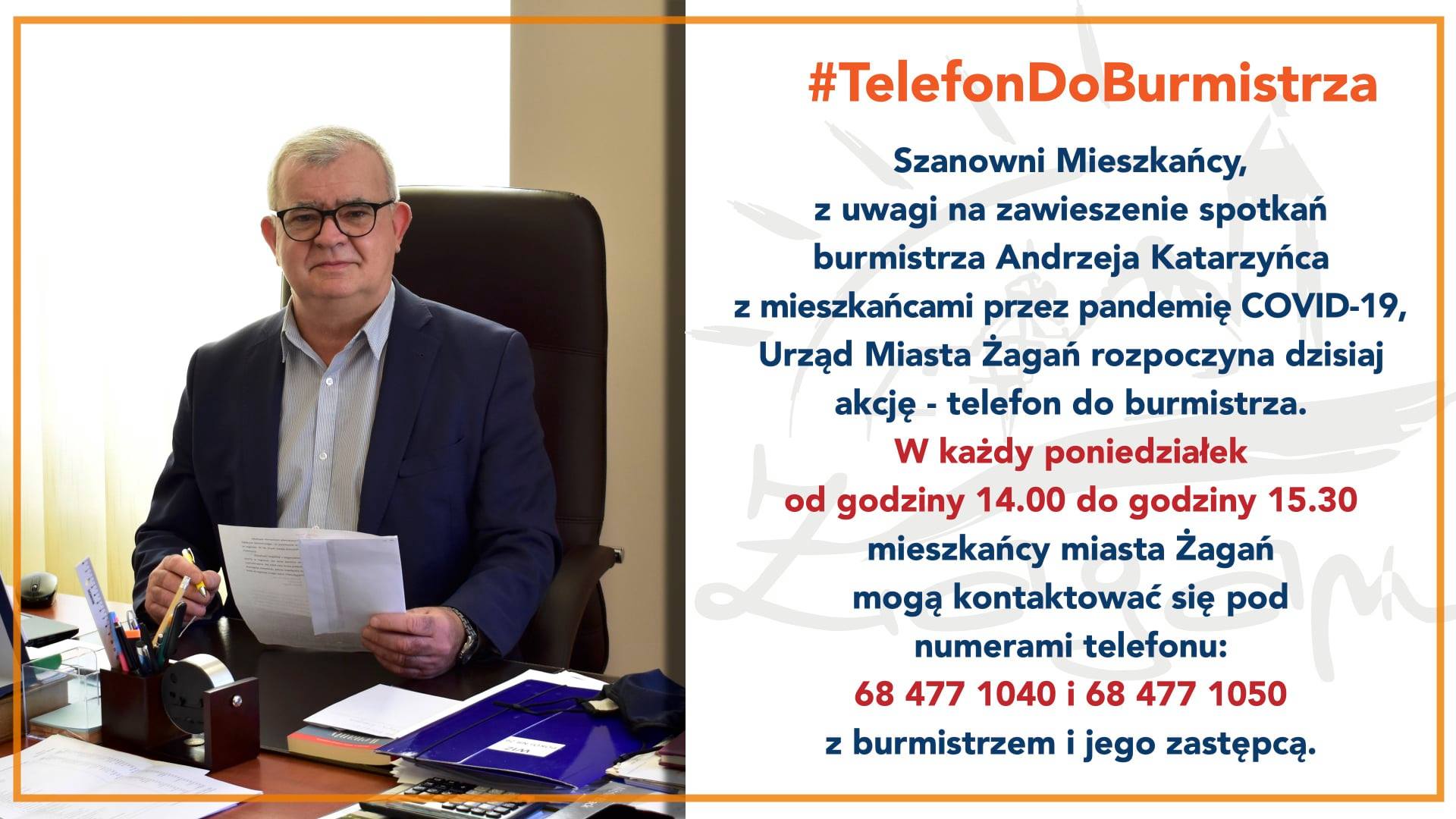 z uwagi na zawieszenie spotkań burmistrza Andrzeja Katarzyńca z mieszkańcami przez pandemię COVID-19, Urząd Miasta Żagań rozpoczyna dzisiaj akcję “telefon do burmistrza”. W każdy poniedziałek od godziny 14.00 do 15.30 mieszkańcy Żagania mogą kontaktować się z burmistrzem i jego zastępcą pod numerami telefonu 68 477 10 40 lub 68 477 10 50.