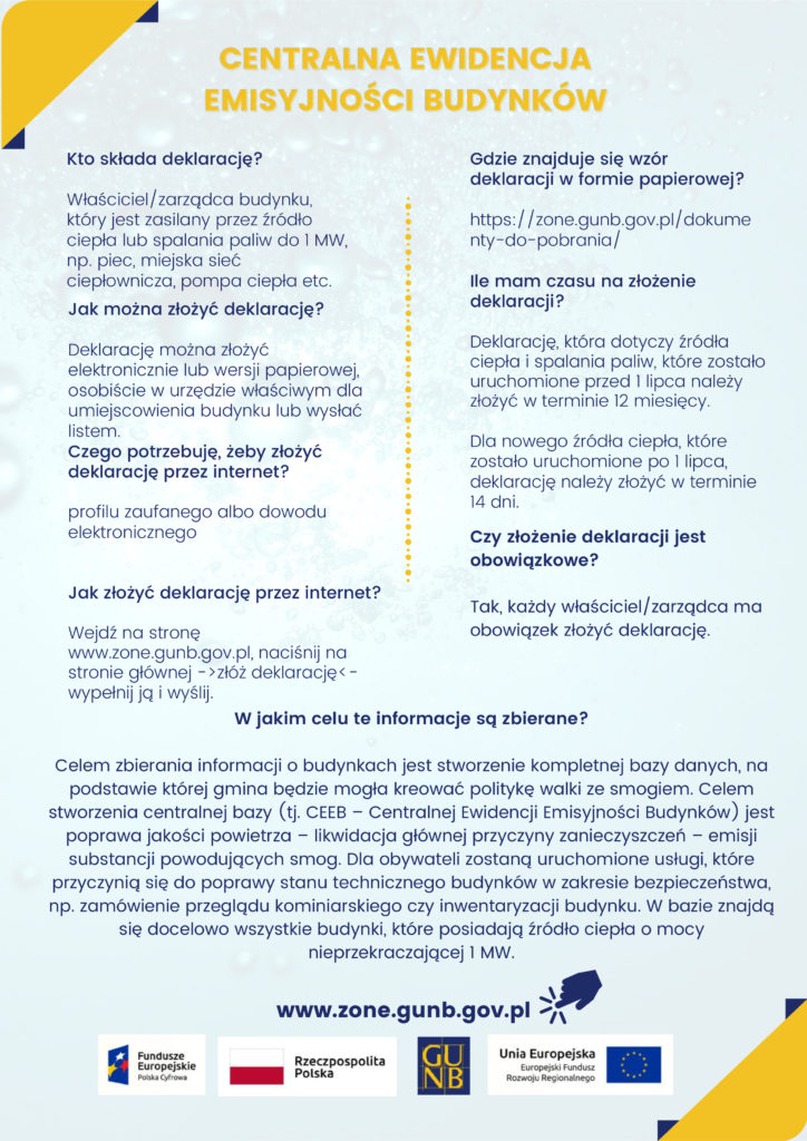 Więcej informacji na stronie GUNB: www.gunb.gov.pl/strona/centralna-ewidencja-emisyjnosci-budynkow-faq