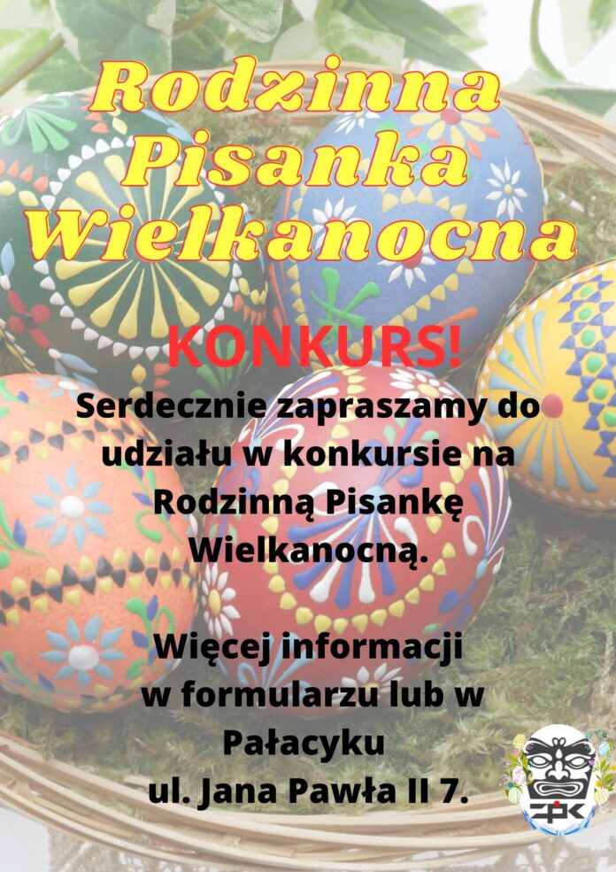 Żagański Pałac Kultury zaprasza rodziny do udziału w konkursie wielkanocnym “Rodzinna Pisanka”. Warunkiem udziału jest wykonanie i dostarczenie do Pałacyku przy ulicy Jana Pawła II 7 pracy wraz z formularzem zgłoszeniowym. Pracę należy dostarczyć w terminie do 20 marca 2023 roku do pałacyku. “Rodzinną pisankę” można wykonać w dowolnej technice (przy pomocy kordonka, bloku technicznego, kartonu, waty, wstążki, siana czy wosku). Minimalna wielkość pracy to 40 cm, maksymalna 120 cm.