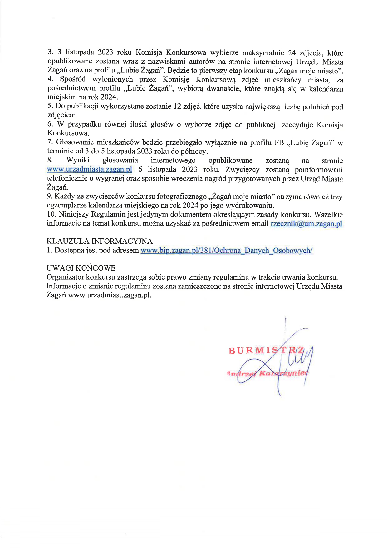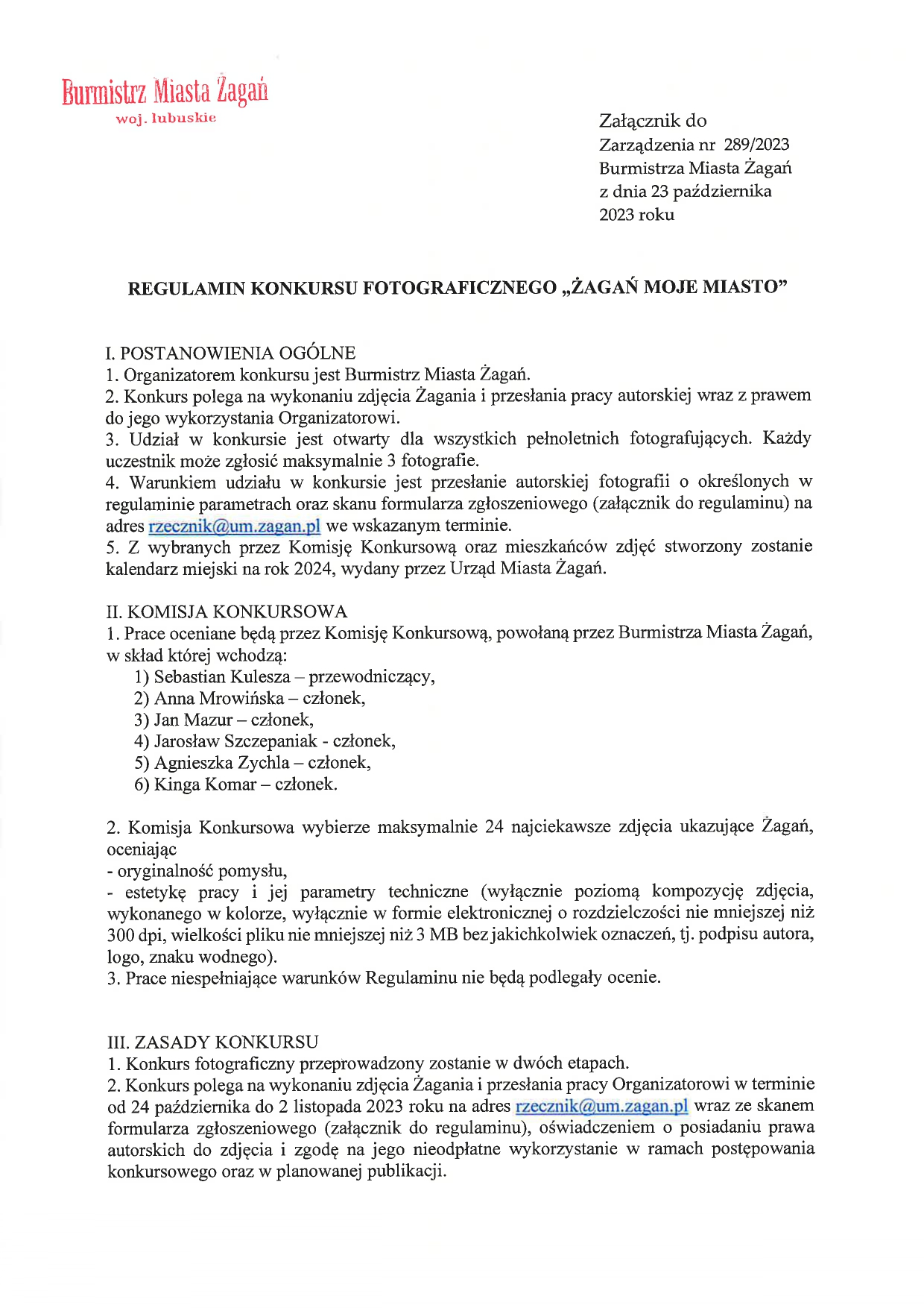 Od 24 października do 2 listopada 2023 roku należy przesłać maksymalnie 3 zdjęcia. Prace muszą być wykonane w kolorze, przedstawiać wyłącznie poziomą kompozycję i być dobrej jakości. Czekamy zatem na pliki o rozdzielczości nie mniejszej niż 300 dpi i wielkości nie mniejszej niż 3 MB. Zdjęcia wraz z wypełnionym formularzem zgłoszeniowym, potwierdzającym zgodę na publikację materiału, należy wysłać na adres rzecznik@um.zagan.pl