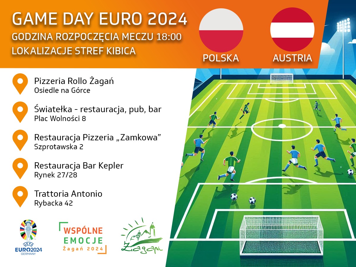Dziś o godzinie 18.00 zapraszamy do wspólnego kibicowania w żagańskiej strefie kibica. Wspierajmy naszą reprezentację, która w ramach EURO 2024 rozegra mecz z reprezentacją Austrii. Liczymy na Was i na prawdziwe sportowe emocje! Lokalizacje wchodzące w skład żagańskiej strefy kibica: