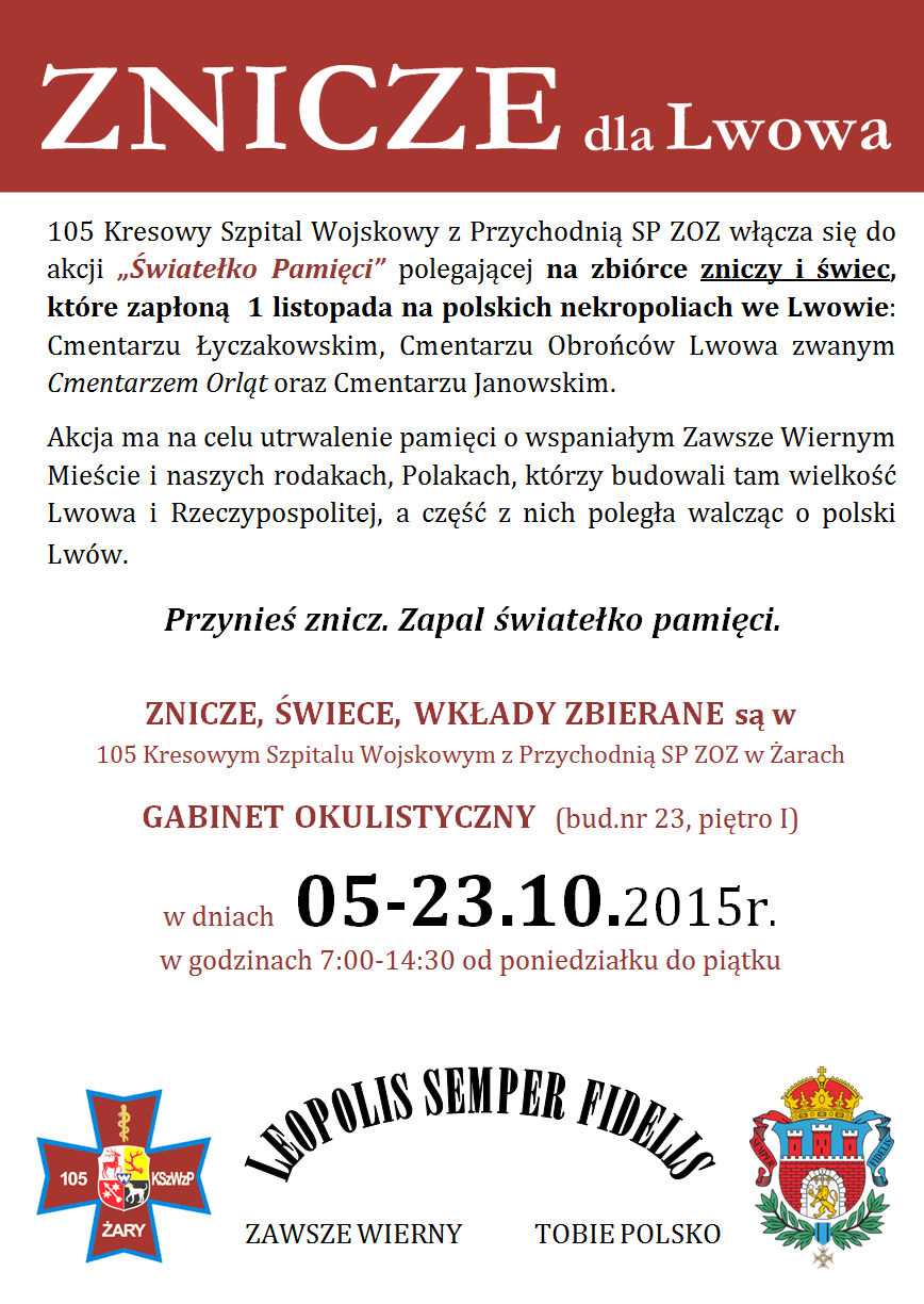 105 Kresowy Szpital Wojskowy z Przychodnią włącza się do akcji „Światełko Pamięci” zainicjowanej kilka lat temu przez Radio Lwów i ośrodek Telewizji Polskiej w Rzeszowie, a polegającej na zbiórce zniczy i świec, które zapłoną 1 listopada na polskich nekropoliach we Lwowie: Cmentarzu Łyczakowskim, Cmentarzu Obrońców Lwowa zwanym popularnie Cmentarzem Orląt oraz Cmentarzu Janowskim.