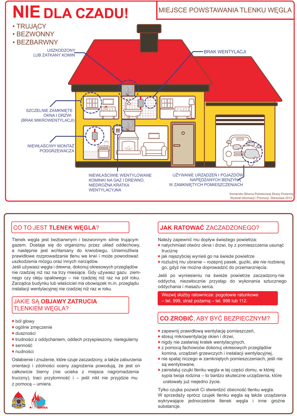 W związku ze zbliżającym się sezonem zimowym i rozpoczętym sezonem grzewczym przypominamy o zagrożeniach, które niesie ze sobą czad i brak kontroli nad instalacją grzewczą. Tragedie ludzkie są często konsekwencją niewiedzy. Tlenek węgla w statystykach zatruć zajmuje trzecie miejsce po zatruciach lekami i alkoholem.