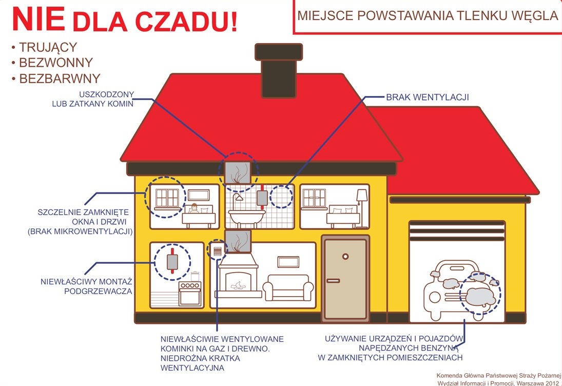 Skąd ta trucizna bierze się w naszym otoczeniu? Tlenek węgla, potocznie zwany czadem, jest gazem silnie trującym, bezbarwnym i bezwonnym (powoduje to problemy z jego wykryciem). Powstaje wówczas, gdy coś się spala (pali), a w otoczeniu, gdzie przebiega ten proces jest za mało powietrza (tlenu). Potencjalne źródła czadu w pomieszczeniach mieszkalnych to: kominki, gazowe podgrzewacze wody, piece węglowe, gazowe lub olejowe i kuchnie gazowe. Zagrożeniem jest nie tylko brak dopływu powietrza, ale też nieprawidłowy odpływ spalin. Szczelnie pozamykane okna (czasami jeszcze dodatkowo uszczelnione), pozaklejane kratki wentylacyjne, brak otworów wentylacyjnych w drzwiach łazienkowych, jak również brak regularnych kontroli drożności przewodów wentylacyjnych i kominowych sprawiają, że w naszych mieszkaniach lub domach możemy nie być bezpieczni. W niewietrzonych pomieszczeniach bardzo łatwo może dojść do tragedii. Do zatruć często dochodzi w nowo wyremontowanych mieszkaniach, z nowymi piecami, nie mającymi indywidualnych przewodów napowietrzających i gdzie z przyczyn oszczędnościowych zlikwidowano (zasłonięto) przewody wentylacyjne, a okna i drzwi są zbyt szczelne.