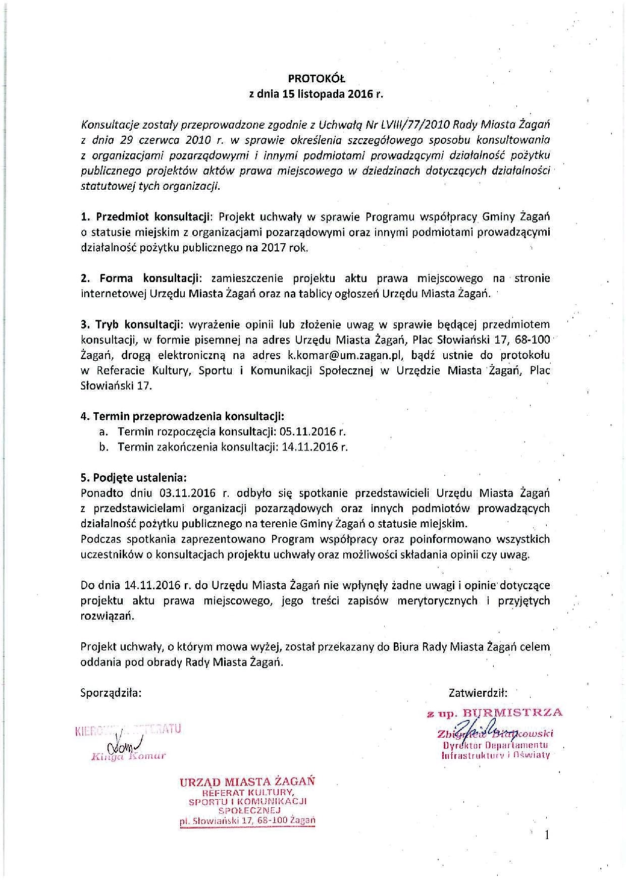 Informujemy, że w dniach 5 – 14.11.2016 roku odbyły się konsultacje projektu uchwały w sprawie Programu współpracy Gminy Żagań o statusie miejskim z organizacjami pozarządowymi oraz innymi podmiotami prowadzącymi działalność pożytku publicznego na 2017 rok. Do dnia 14.11.2016 r. do Urzędu Miasta Żagań nie wpłynęły żadne uwagi i opinie dotyczące projektu aktu prawa miejscowego, jego treści zapisów merytorycznych i przyjętych rozwiązań.