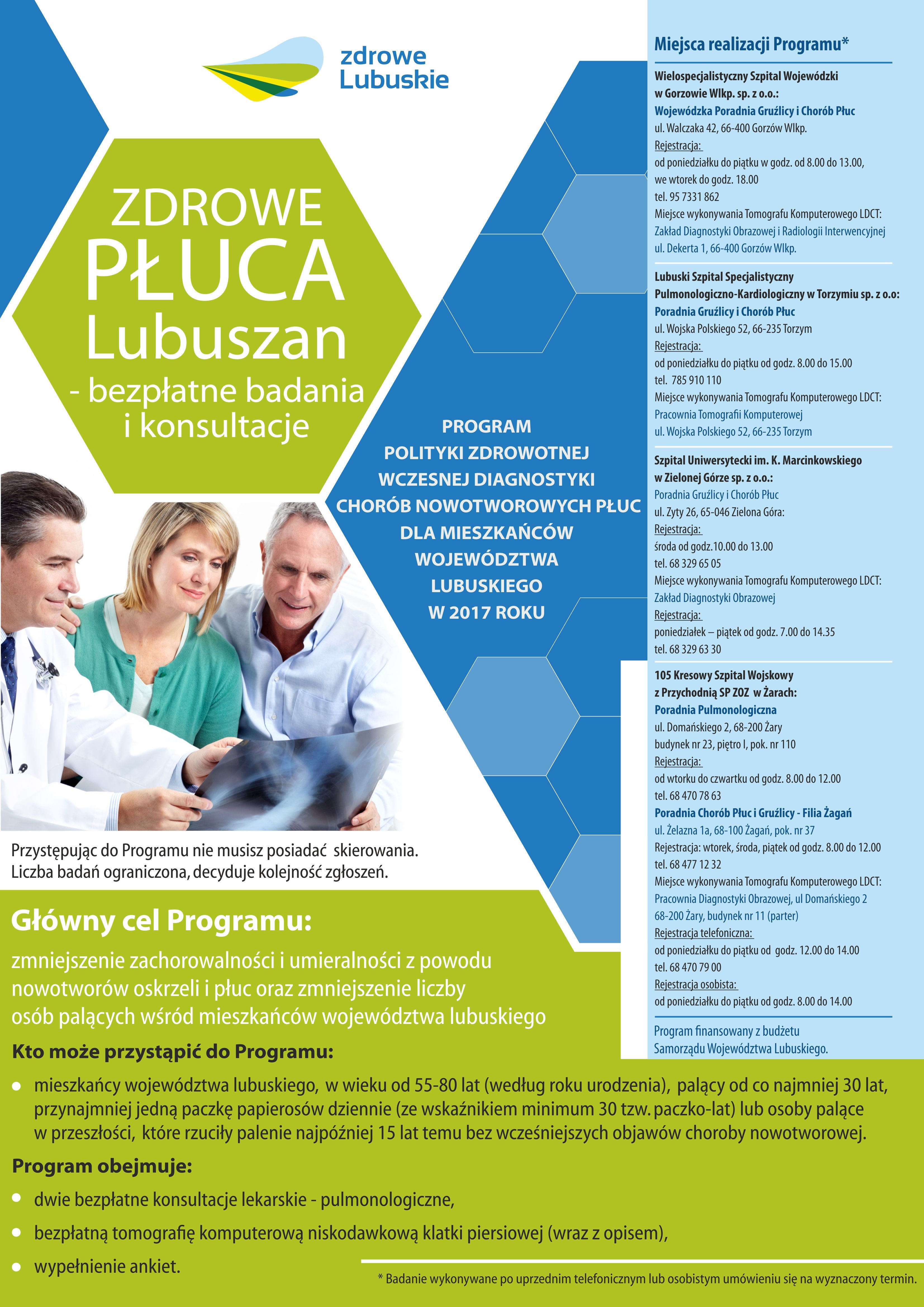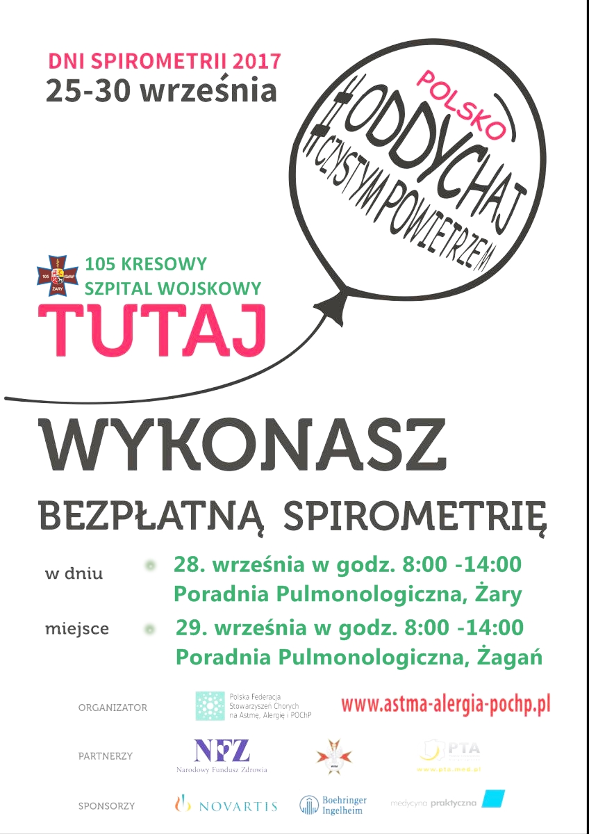 W ramach akcji “Zdrowe płuca Lubuszan” 105 Kresowy Szpital Wojskowy zaprasza na badania. Konsultacje odbywać się będą również w Żaganiu, gdzie do końca roku można zarejestrować się i skorzystać z konsultacji lekarskiej. W ramach programu badania mogą wykonać osoby w wieku 55-80 lat (szczegóły na plakacie). Placówka zaprasza równocześnie na dni spirometrii, w ramach których 29 września 2017 roku w godzinach od 8.00 do 14.00 w żagańskiej Poradni Pulmonologicznej można wykonać bezpłatne badanie.