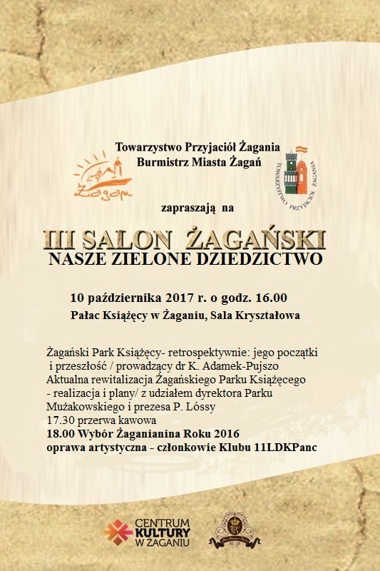 Towarzystwo przyjaciół Żagania zaprasza we wtorek 10 października o godz. 16.00 do sali Kryształowej Pałacu Książęcego na trzecią edycję wydarzenia kulturalnego, jakim jest Salon Żagański. Będziemy mogli posłuchać ciekawego wykładu „Żagański Park Książęcy – retrospektywnie: jego początki i przeszłość”, fragmentu opowiadania Bożeny Nemcowej „Siostry” opisujący Park Książęcy w czasie imienin księżnej Doroty Talleyrand-Perygord, a także dowiedzieć się jak przebiega rewitalizacja parku i jakie działania są w planach. Dowiemy się jak mieszkańcy Żagania postrzegają pielęgnację i dbałość o miejską zieleń w pozostałych parkach, skwerach oraz wzdłuż ulic. Będziemy szukać odpowiedzi, jak czerpać wzorce z dorobku innych w zakresie utrzymania i rozwoju przyrodniczego dziedzictwa kulturowego na przykładzie Parku w Bad Muskau i Europejskiego Związku Parków Łużyckich. Dowiemy się o zgłoszeniu czterech „siostrzanych platanów do konkursu Europejskie Drzewo Roku, a także jak wygląda żagański szlak „Zielonych atrakcji”. Nasze pomniki przyrody i drzewa pretendujące do miana pomników przyrody – wg. projektu z 2002 roku „Euroregionu Sprewa -Nysa – Bóbr”.