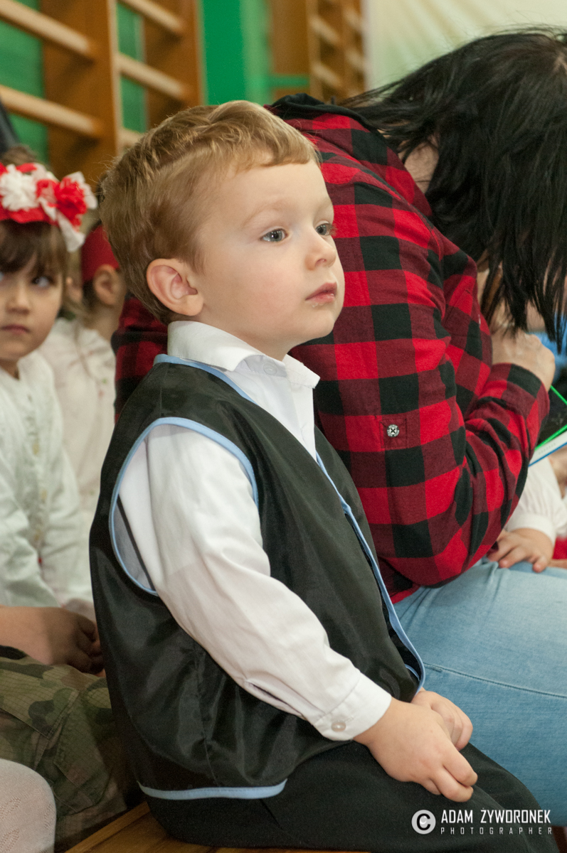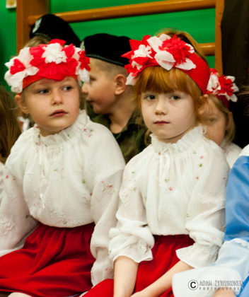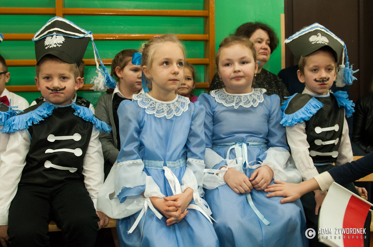 Mali ułani, dziewczynki w biało-czerwonych wiankach oraz damy królowie wystąpili podczas uroczystości patriotycznej w Publicznej Szkole Podstawowej nr 3 na osiedlu Moczyń.
