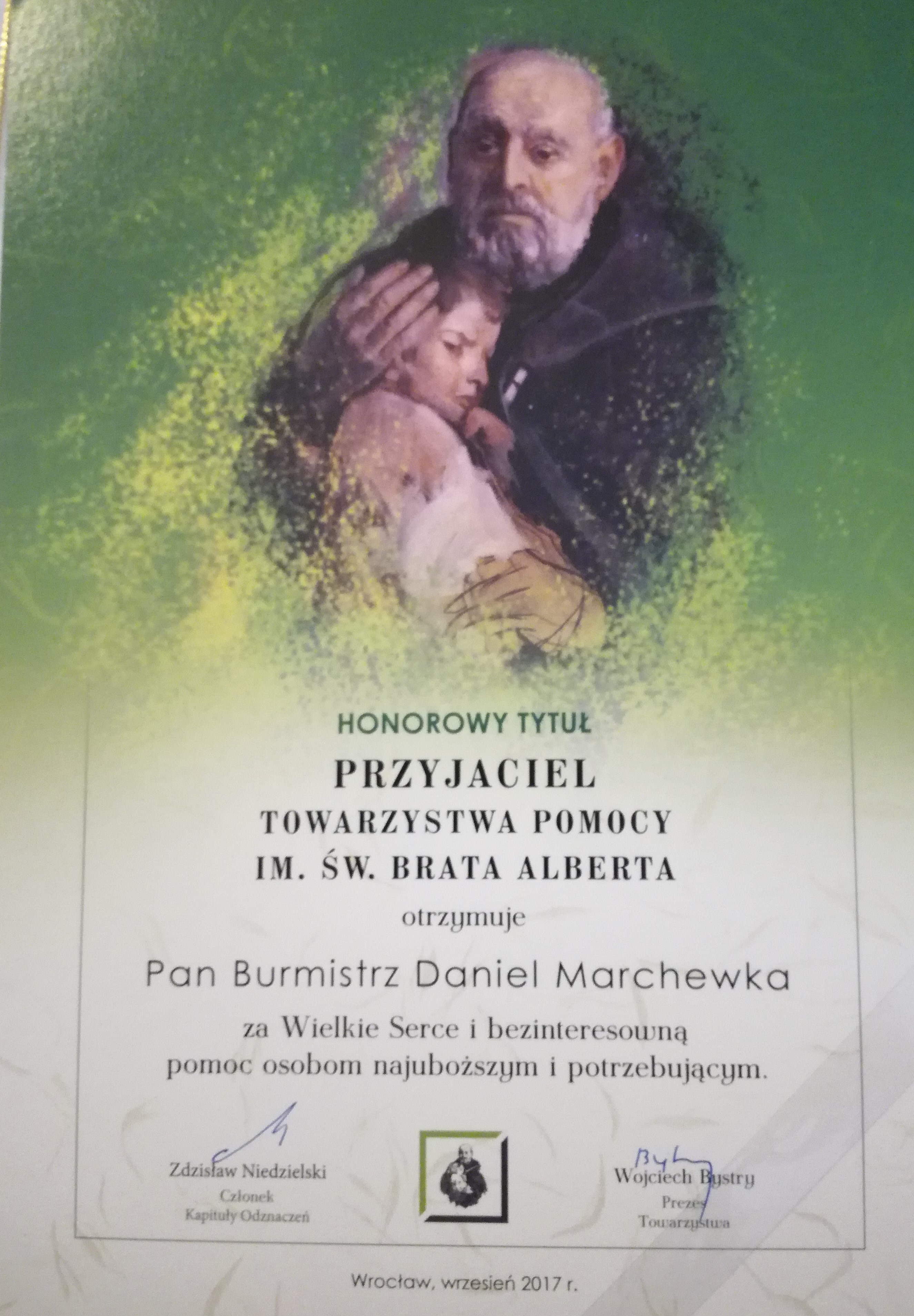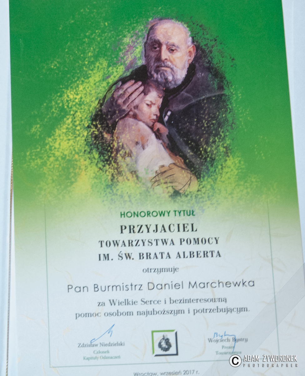 Towarzystwo Pomocy im. Świętego Brata Alberta dziękuje władzom i mieszkańcom miasta za wsparcie oraz pomoc w budowie i prowadzeniu żarskiego hospicjum. Z okazji 25-lecia istnienia Towarzystwa burmistrz Daniel Marchewka otrzymał do organizacji charytatywnej honorowy tytuł Przyjaciela Towarzystwa Pomocy im Św. Brata Alberta.
