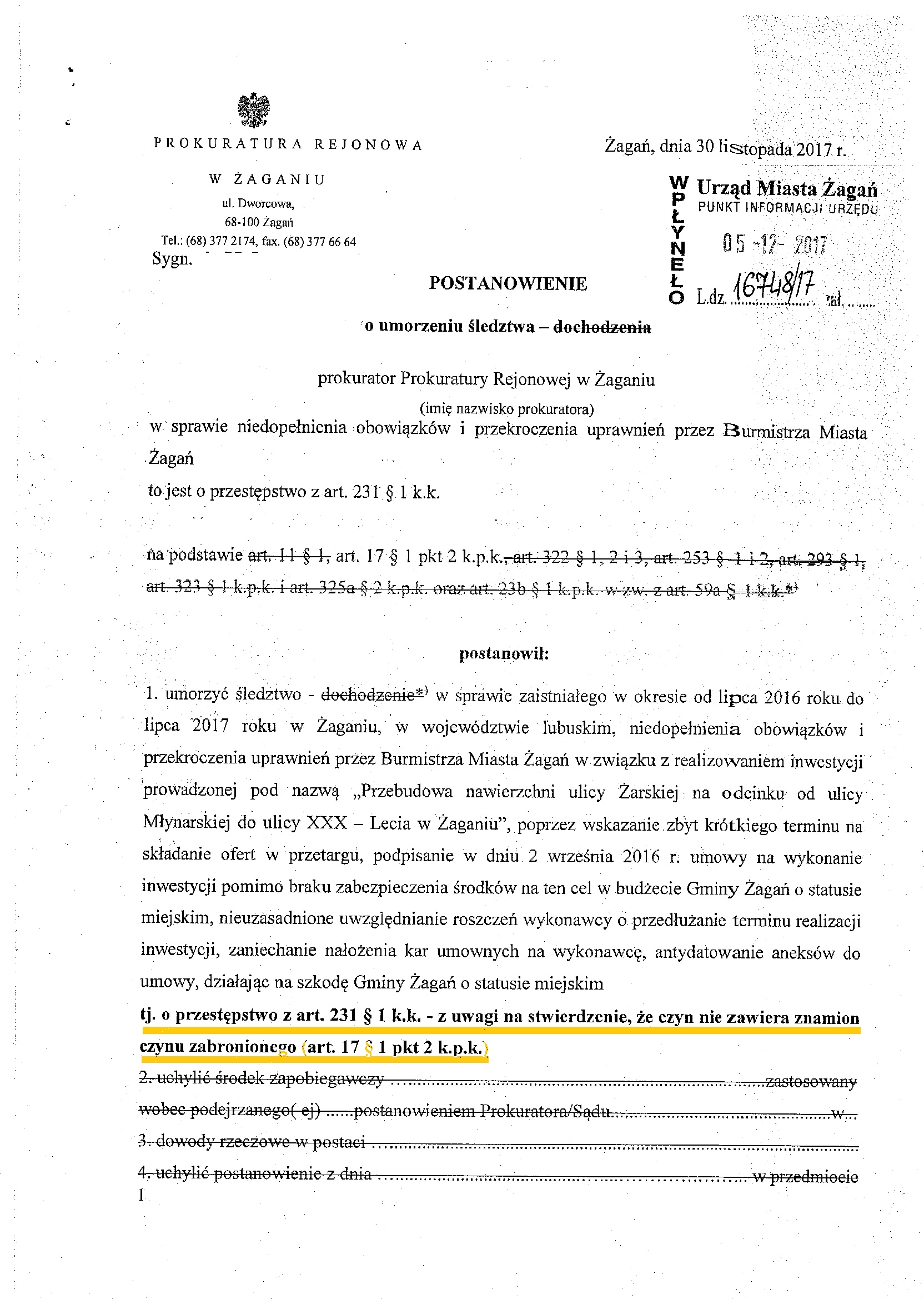 30 listopada Prokuratura Rejonowa w Żaganiu umorzyła śledztwo w sprawie rzekomego popełnienia przestępstwa przez burmistrza Daniela Marchewkę w związku z przebudową ul. Żarskiej. Donos w tej sprawie złożył radny powiatowy Andrzej Katarzyniec, kandydat na burmistrza miasta.
