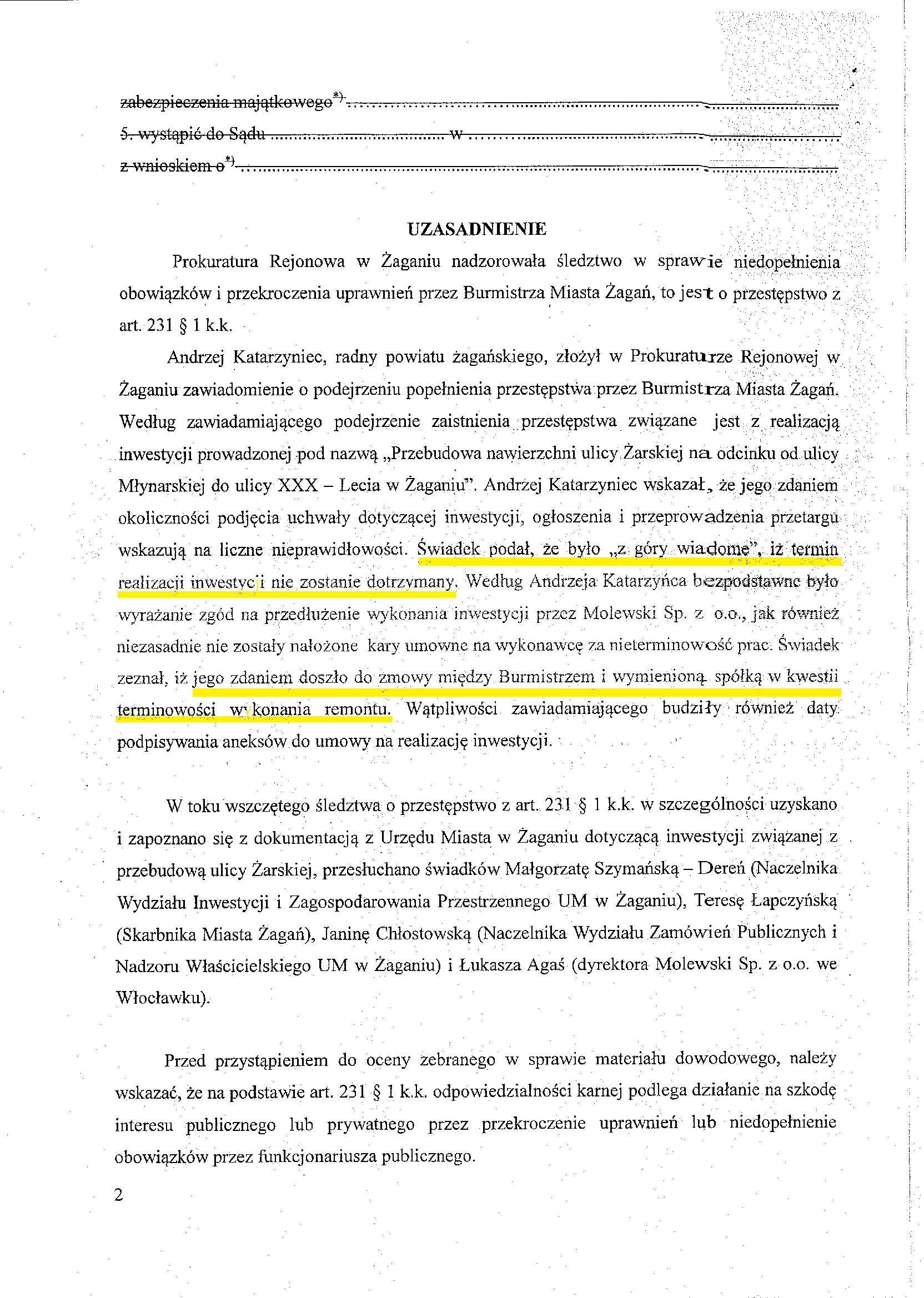 Po wpłynięciu oskarżeń śledztwo toczyło się pod kątem przestępstwa z art. 231 paragraf 1 k.k., traktującego o przekroczeniu uprawnień przez funkcjonariusza publicznego, niedopełnieniu obowiązków i działaniu na szkodę interesu publicznego, podlegającego karze pozbawienia wolności do lat 3.