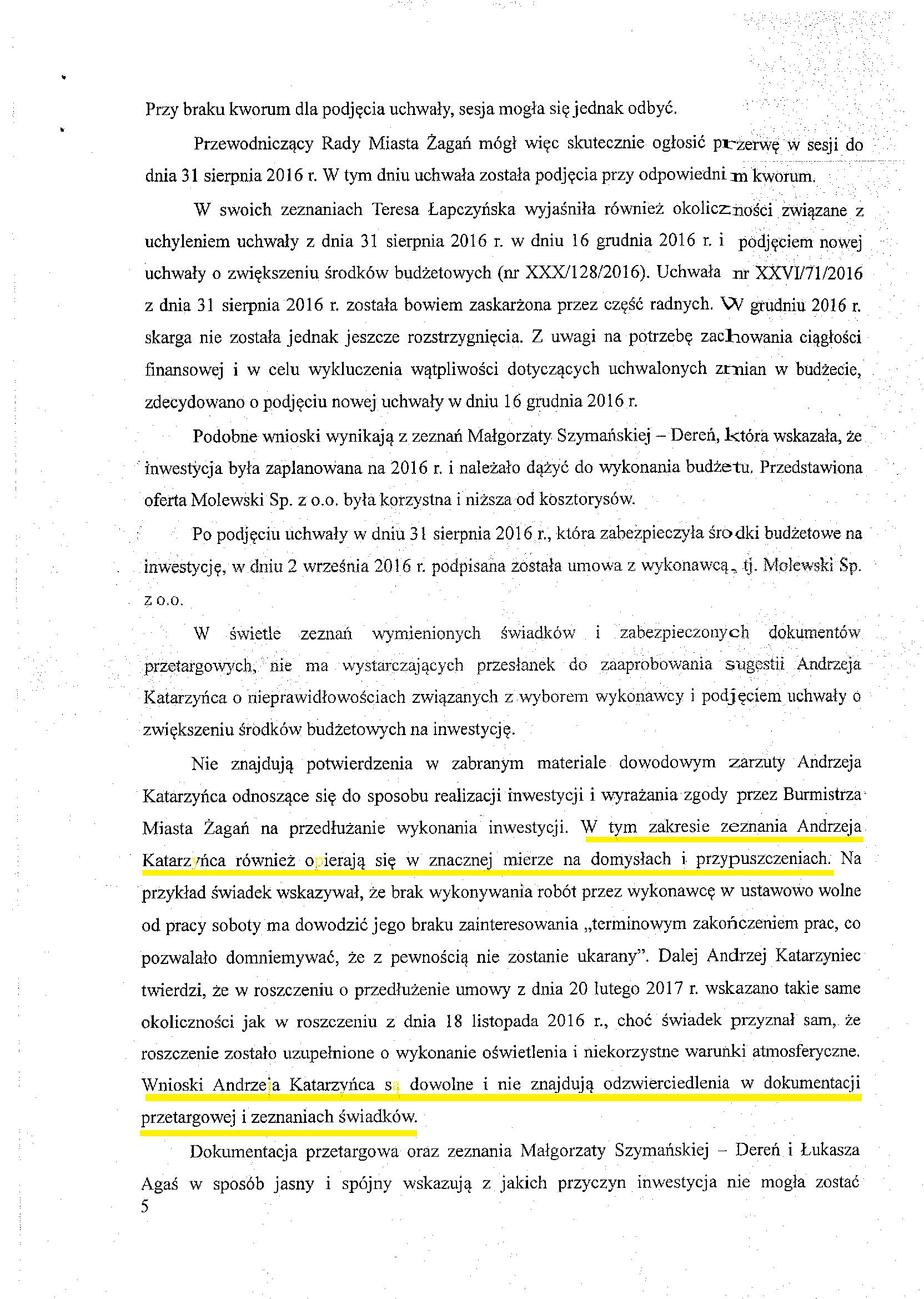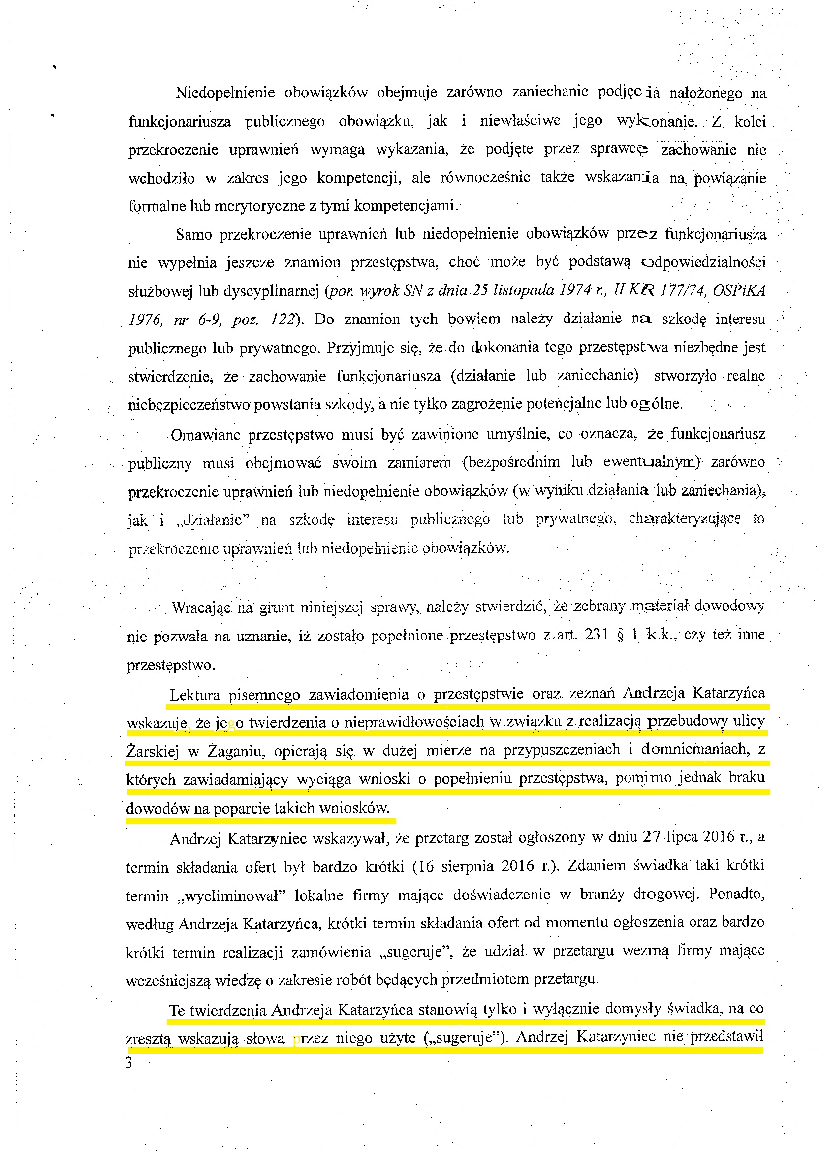 Podkreślił, że lektura pisemnego zawiadomienia o przestępstwie oraz zeznania Andrzeja Katarzyńca opierają się w dużej mierze na przypuszczeniach i domniemaniach, z których wyciąga on wnioski o popełnieniu przestępstwa, mimo braku dowodów na poparcie tych wniosków. – Sugestie Andrzeja Katarzyńca są zatem nieuprawnione – konkluduje prokurator. – Wnioski są dowolne i nie znajdują odzwierciedlenia w dokumentacji przetargowej i zeznaniach świadków.