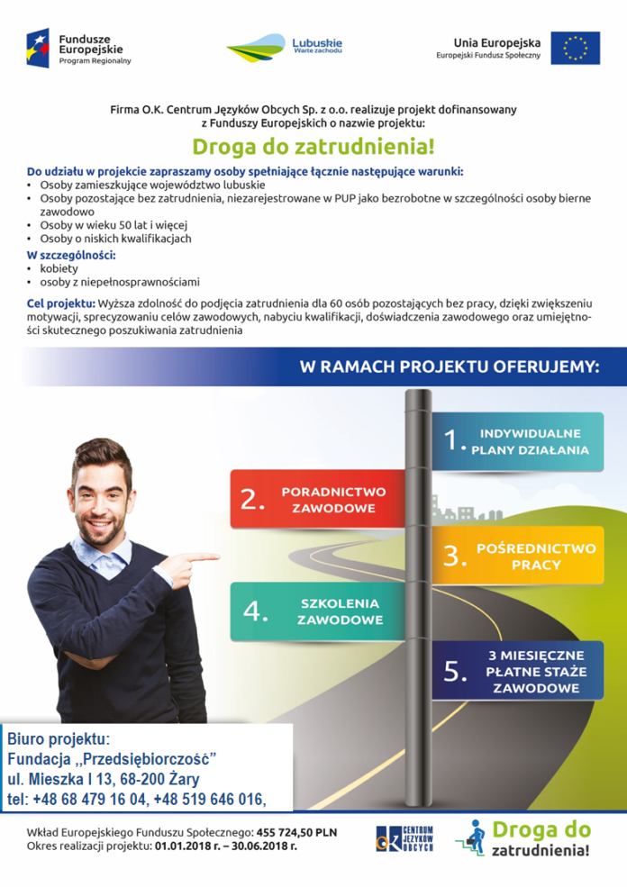 Fundacja ,,Przedsiębiorczość” zachęca do wzięcia udziału w projekcie ,,Droga do zatrudnienia” osoby powyżej 50-go roku życia z województwa lubuskiego, które obecnie są nieaktywne zawodowo.