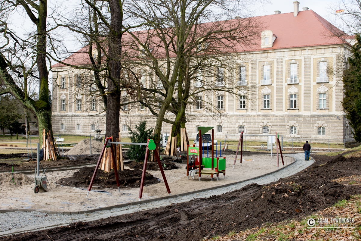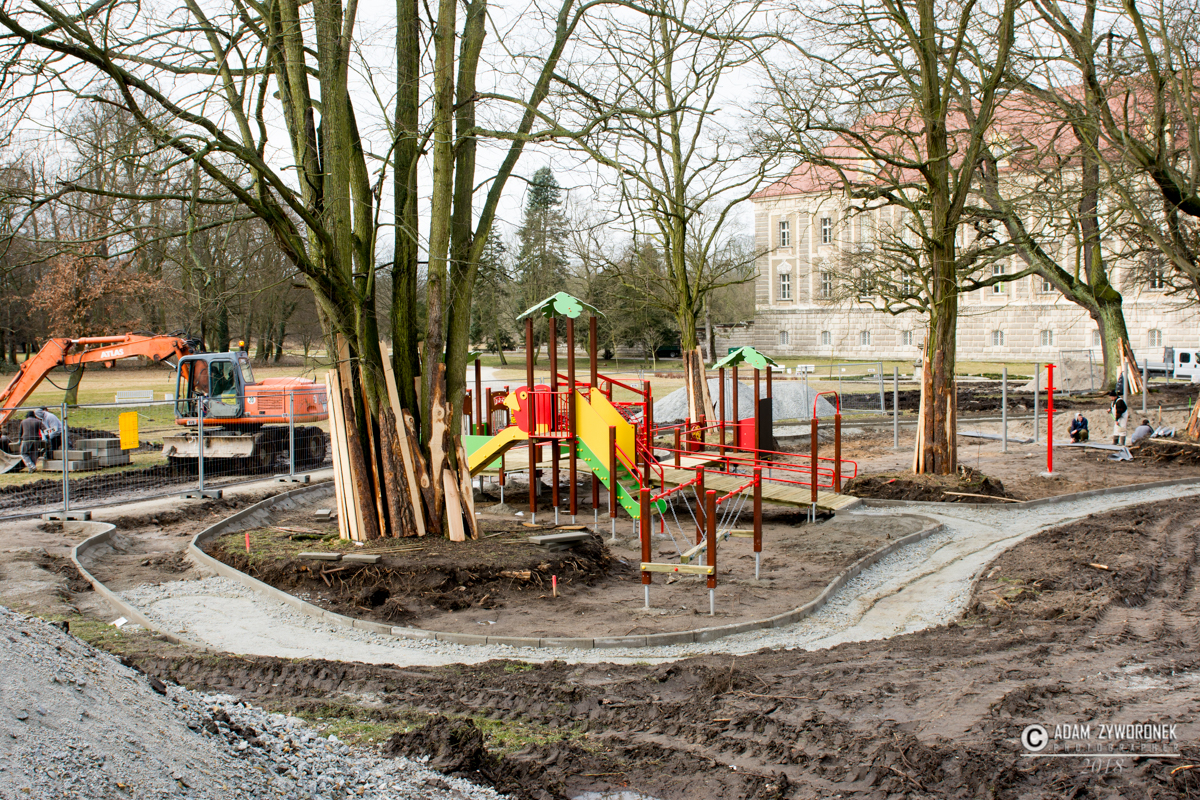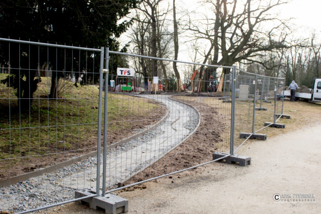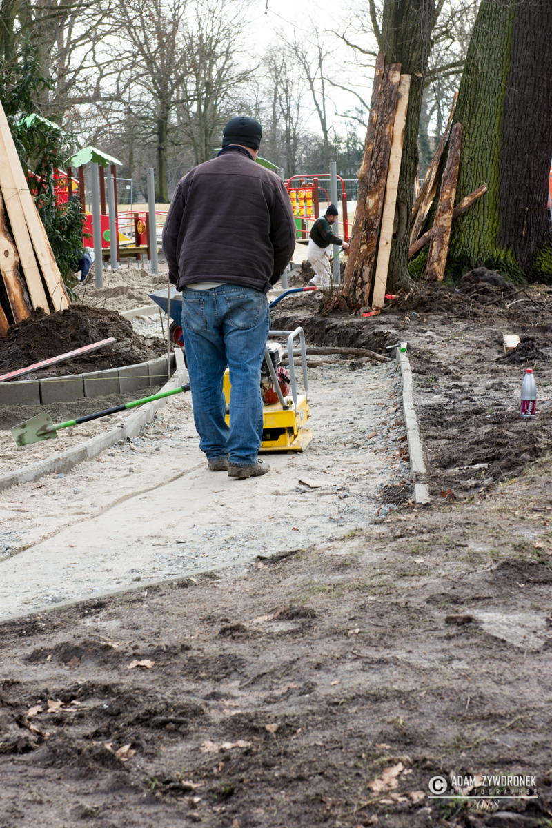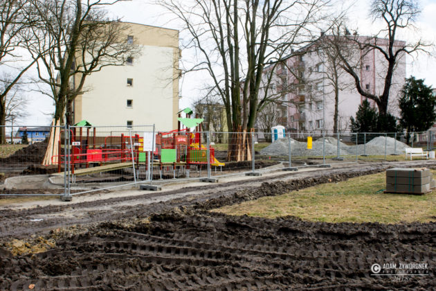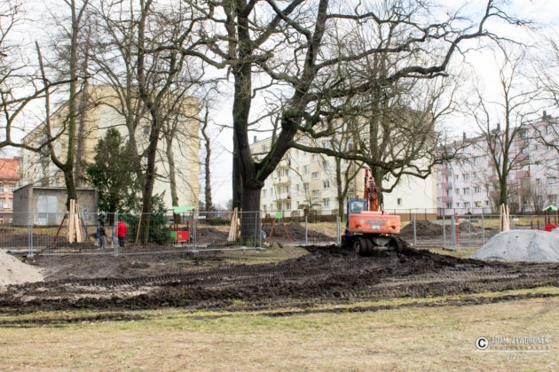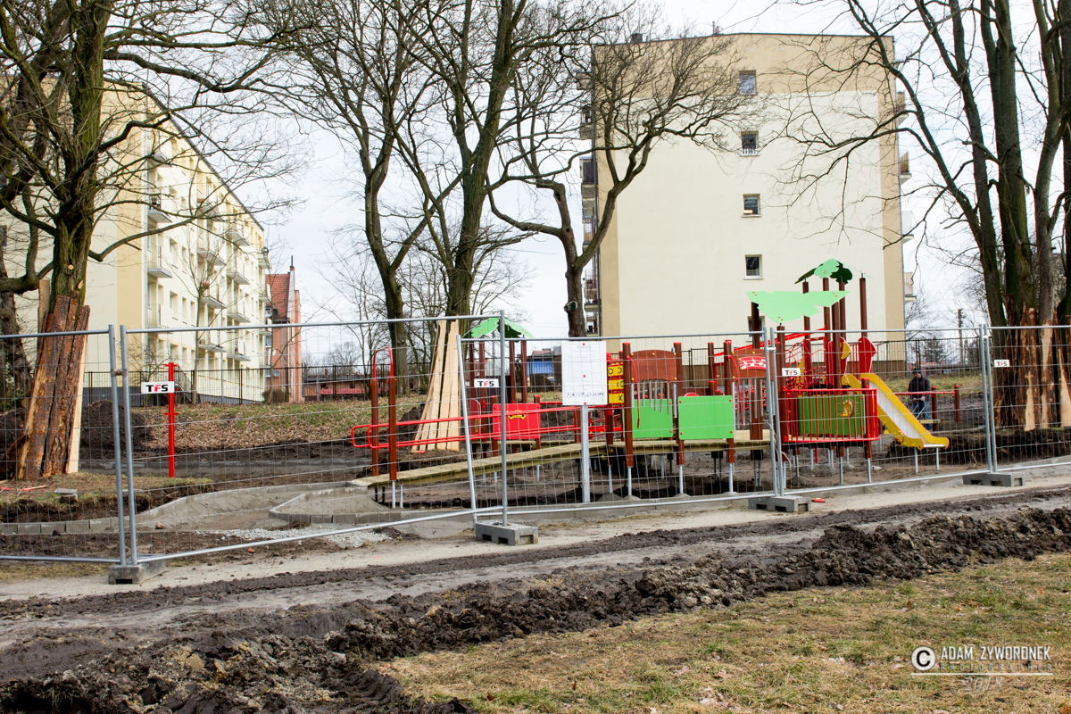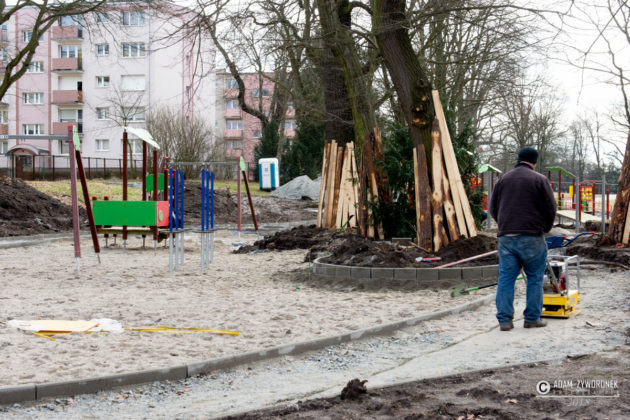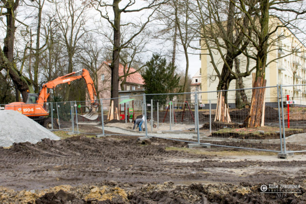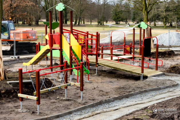 Przy parkowym ogrodzeniu od strony ul. Szprotawskiej już widać wyrastające z ziemi urządzenia do zabawy dla dzieci. Powstają też alejki, wiodące do placu.