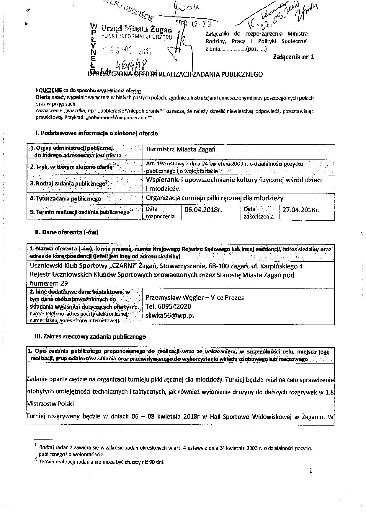 Informujemy, iż 23 marca 2018 r. do Urzędu Miasta Żagań wpłynęła oferta na realizację zadania publicznego pn. „Organizacja turnieju piłki ręcznej dla młodzieży”, złożona przez Uczniowski Klub Sportowy „CZARNI” Żagań z siedzibą przy ul. Karpińskiego 4, 68-100 Żagań, na kwotę 5 000,00 zł (słownie: pięć tysięcy złotych) brutto.
