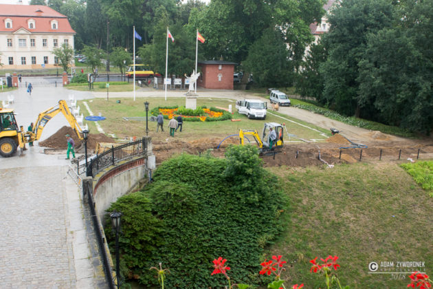 Zasilanie jest doprowadzane do fontanny kamienistej przed Pałacem Książęcym, do kaskady wodnej na skarpie do fosy oraz do fontanny kwiatowej. Prace ziemne wykonuje firma Warsta z Wrzesin.