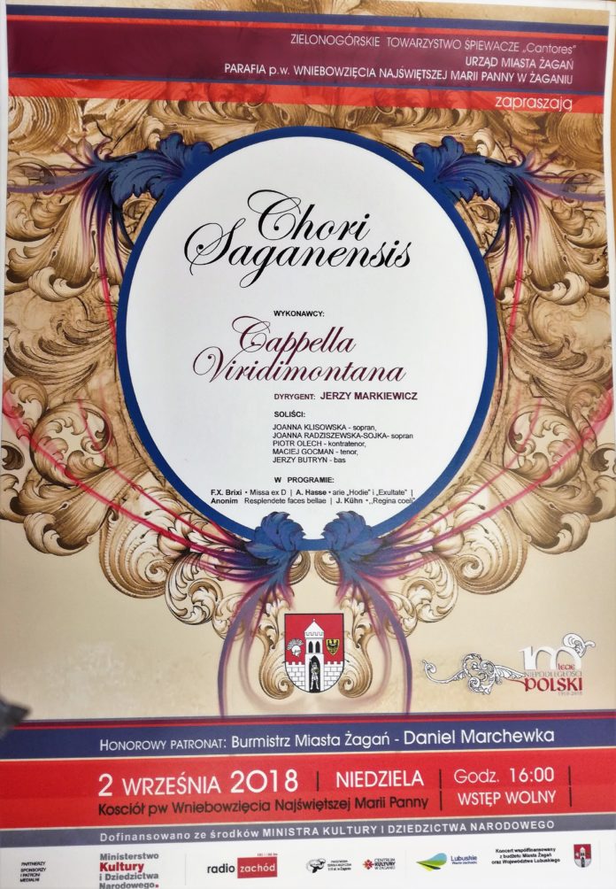 Zielonogórskie Towarzystwo Śpiewacze “Cantores”, Urząd Miasta Żagań oraz Parafia p. w. Wniebowzięcia Najświętszej Marii Panny w Żaganiu zapraszają na koncert Chori Saganiensis w niedzielę 2 września o godz. 16.00 do kościoła przy pl. Klasztornym. Wstęp wolny. W programie: F. X. Brixi – Misa ex D, A. Hasse – arie “Hodie” i “Exultate, Anonim Resplendete bellae, J. Kühn “Regina coeli”.