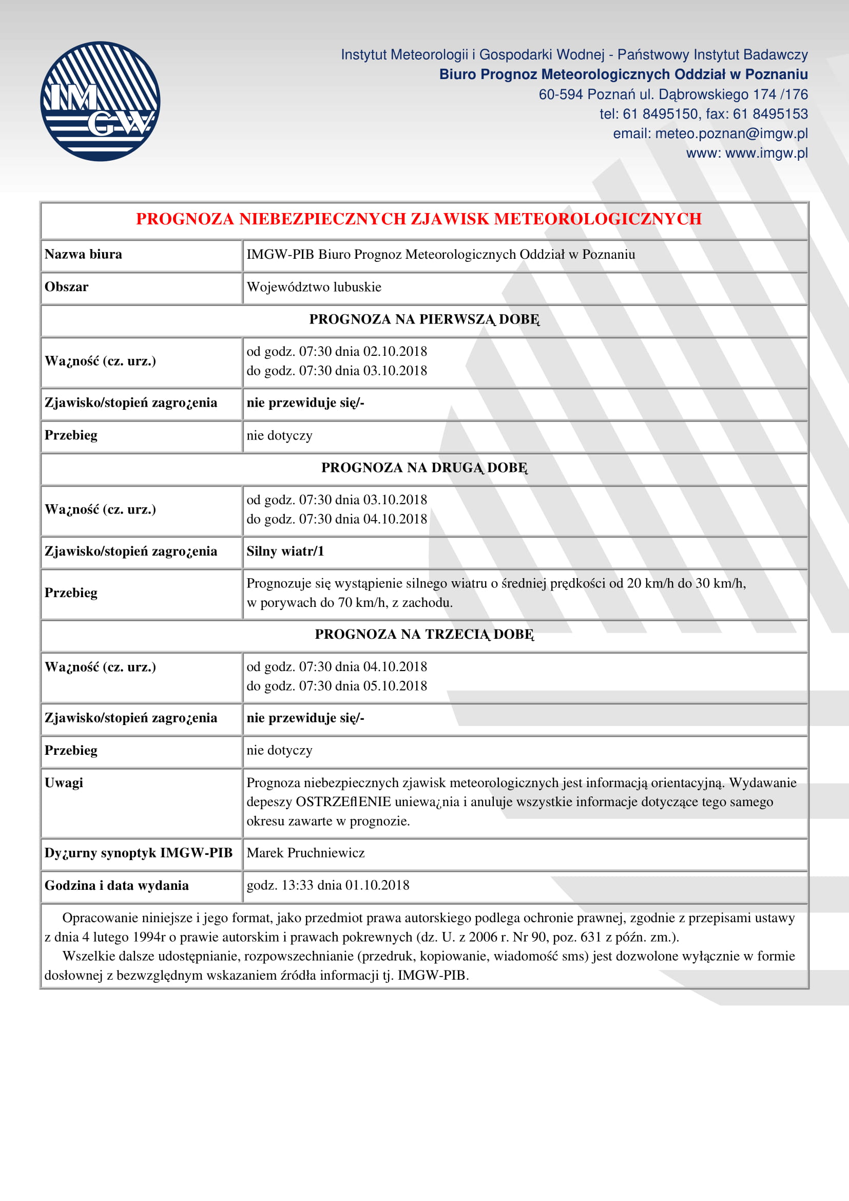 Instytut Meteorologii i Gospodarki Wodnej-PIB Biuro Prognoz Meteorologicznych Oddział w Poznaniu ostrzega przed silnym wiatrem, który będzie wiał od godz. 7.30 we wtorek 2 października, aż do piątku 5 października, do godz. 7.30.