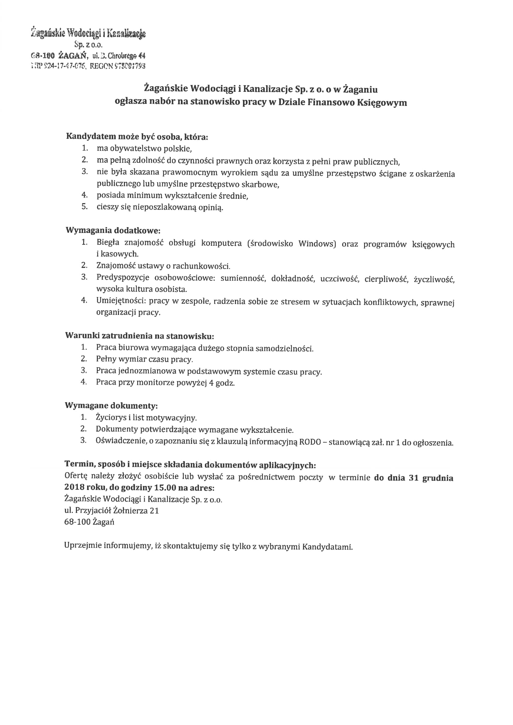 W imieniu spółki informujemy, że Żagańskie Wodociągi i Kanalizacje Sp. z o.o. w Żaganiu poszukuję pracownika do Działu Finansowo-Księgowego. Szczegóły oferty można znaleźć również na stronie internetowej spółki