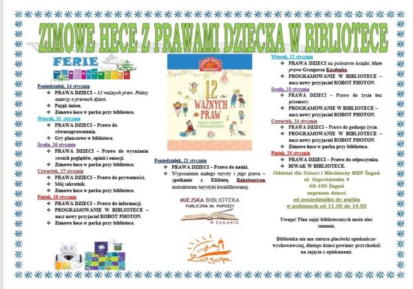Każda z miejskich placówek przygotowała specjalną ofertę, dzięki której dwa tygodnie pełne będą pełne atrakcji. Centrum Kultury zaprasza najmłodszych mieszkańców na “Ferie z Kulturą” prowadzone w salach Pałacu Książęcego. Dla dzieci przygotowano m.in. warsztaty plastyczne, teatrzyki, seanse bajkowe, warsztaty muzyczne oraz pokaz iluzji. Młodzież i dorosłych lubiących dreszczyk emocji Centrum Kultury zaprasza na darmowe projekcje horrorów (w oba czwartki o godzinie 18.00 w holu piwnicznym pałacu. Na codzienne spotkania zaprasza tradycyjnie również Miejska Biblioteka Publiczna, która w tym roku przygotowała cykl zajęć wokół Deklaracji Praw Dziecka, z uwagi na 60. rocznicę jej uchwalenia. Biblioteka zaprasza od poniedziałku do piątku w godzinach od 11.00 do 14.00 na rozmowy o prawach najmłodszych do swojego oddziału dla dzieci. W rozmowach z dziećmi pomoże książka 12 ważnych praw.Polscy autorzy o prawach dzieci, która pogłębi refleksje na temat praw dziecka. Dzieci znajdą w niej dowcipne teksty i bliskie najmłodszym sytuacje. Oprócz rozmów, zabaw integracyjnych oraz plenerowych, warsztatów plastycznych dzieci będą miały okazję do programowania (zabawy z robotem Photon) oraz przede wszystkim poznania swoich praw.