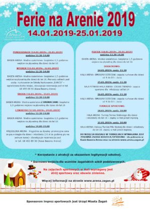 W tym okresie korzystanie z atrakcji odbywa się za okazaniem legitymacji szkolnej, darmowe wejścia dotyczą uczniów żagańskich szkół podstawowych. Na zajęciach sportowych w hali wymagany jest strój sportowy oraz obuwie zmienne! DO WZIĘCIA UDZIAŁU W TURNIEJACH WYMAGANA JEST PISEMNA ZGODA RODZICA/OPIEKUNA – do pobrania w Kasie Basenu Arena.