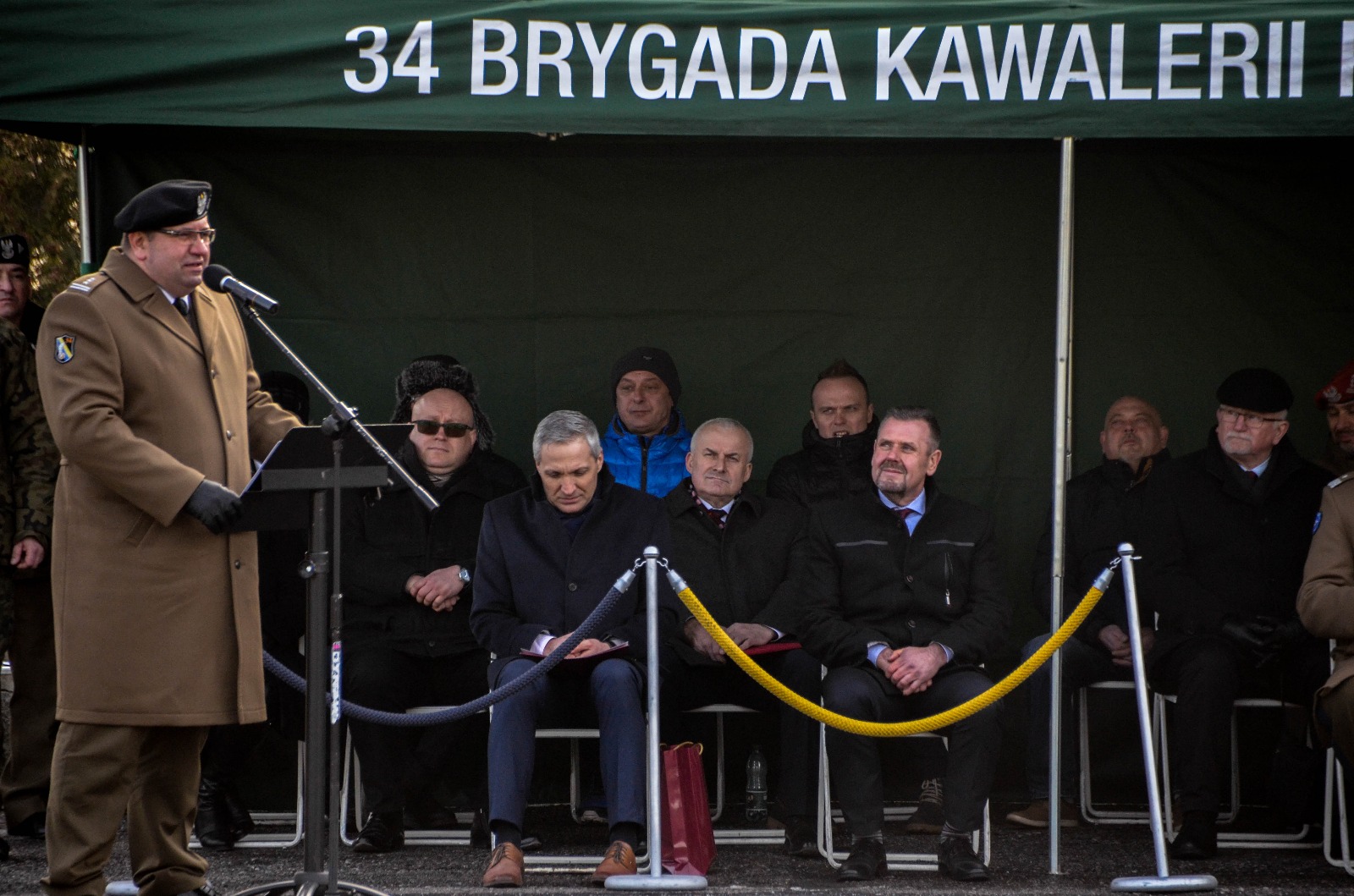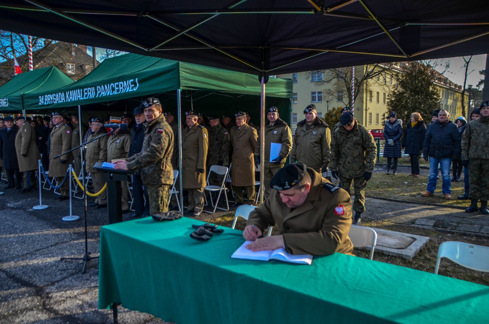 Głównym punktem uroczystego apelu było przekazanie sztandaru brygady. Następnie podpisano protokół przekazania i przyjęcia obowiązków dowódcy 34BKPanc. Dowódca 11LDKPanc, gen. dyw. Stanisław Czosnek w swoim przemówieniu podkreślił, że w życiu, w karierze każdego dowódcy nadchodzi czas przekazania stanowiska, by iść wyżej, awansować, tak jest dziś z dowódcą 34Brygady. Dziękuję za wykonaną tu tytaniczną pracę, za szkolenie, za to, że pomimo ciężkiej sytuacji w jakiej znalazła się brygada byliście w stanie sprostać najtrudniejszym stawianym przed wami zadaniom.