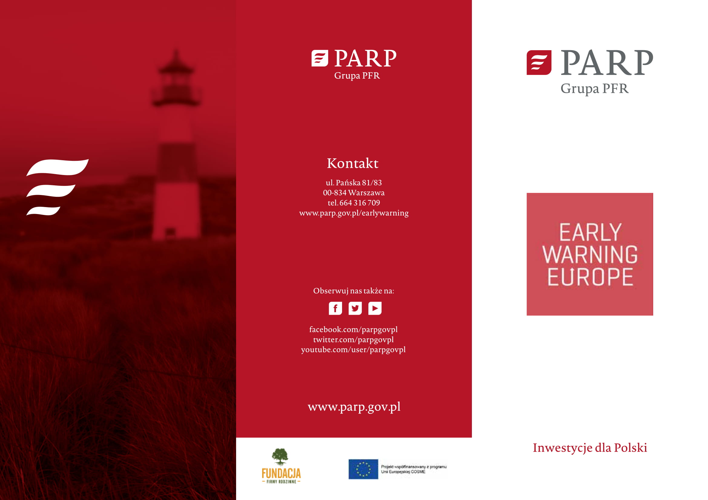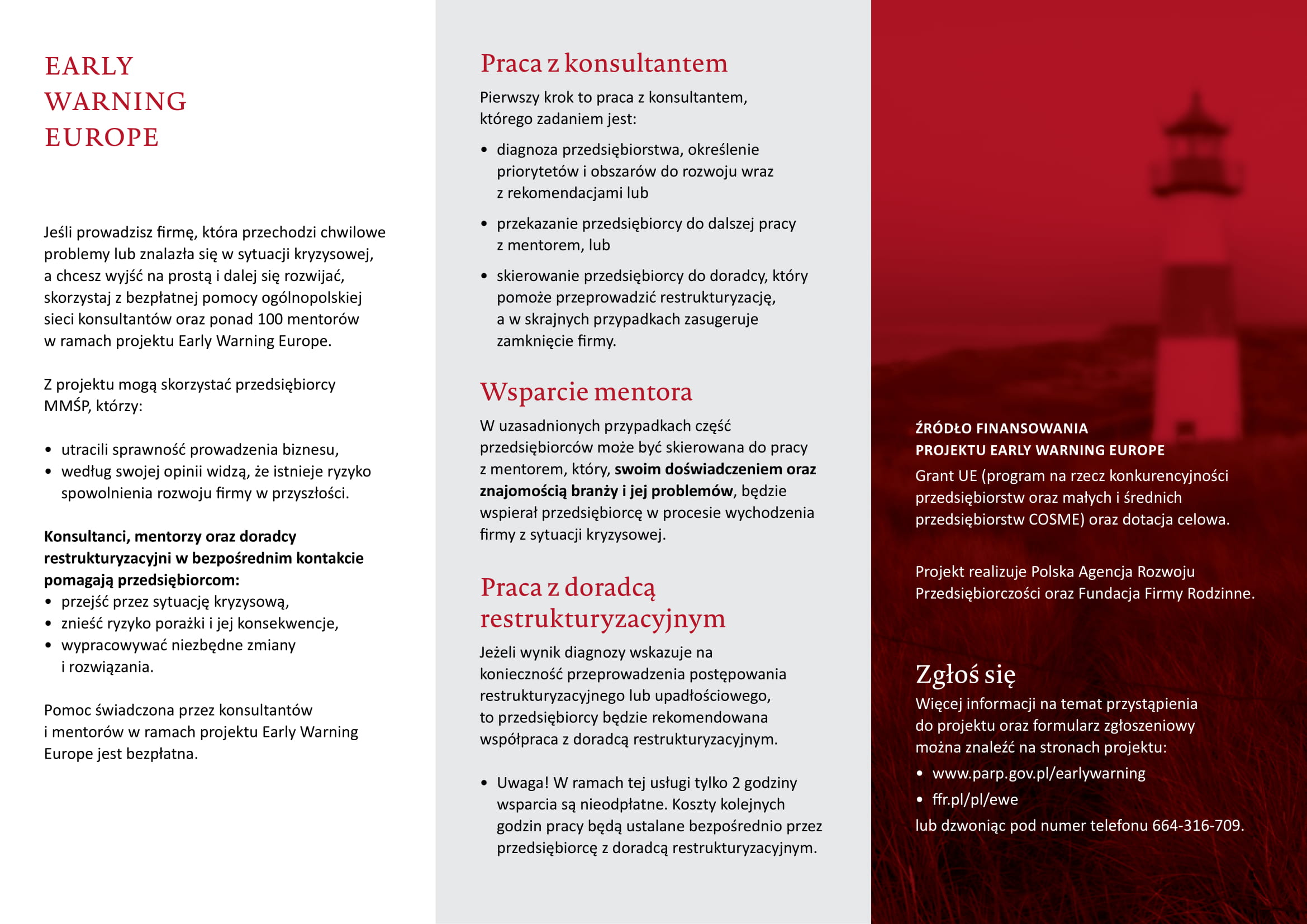 Polska Agencja Rozwoju Przedsiębiorczości oraz Fundacja Firmy Rodzinne realizują projekt Early Warning Europe, którego celem jest udzielanie pomocy firmom i przedsiębiorcom przeżywającym trudności i sytuacje kryzysowe. O wsparcie w ramach Projektu mogą ubiegać się mikro, mali lub średni przedsiębiorcy (MŚP) działający na terenie Polski, którzy na skutek dynamiki rynku, oddziaływania różnych czynników zewnętrznych lub wewnętrznych utracili sprawność prowadzenia biznesu lub, w opinii przedsiębiorcy, istnieje ryzyko spowolnienia rozwoju firmy w przyszłości.