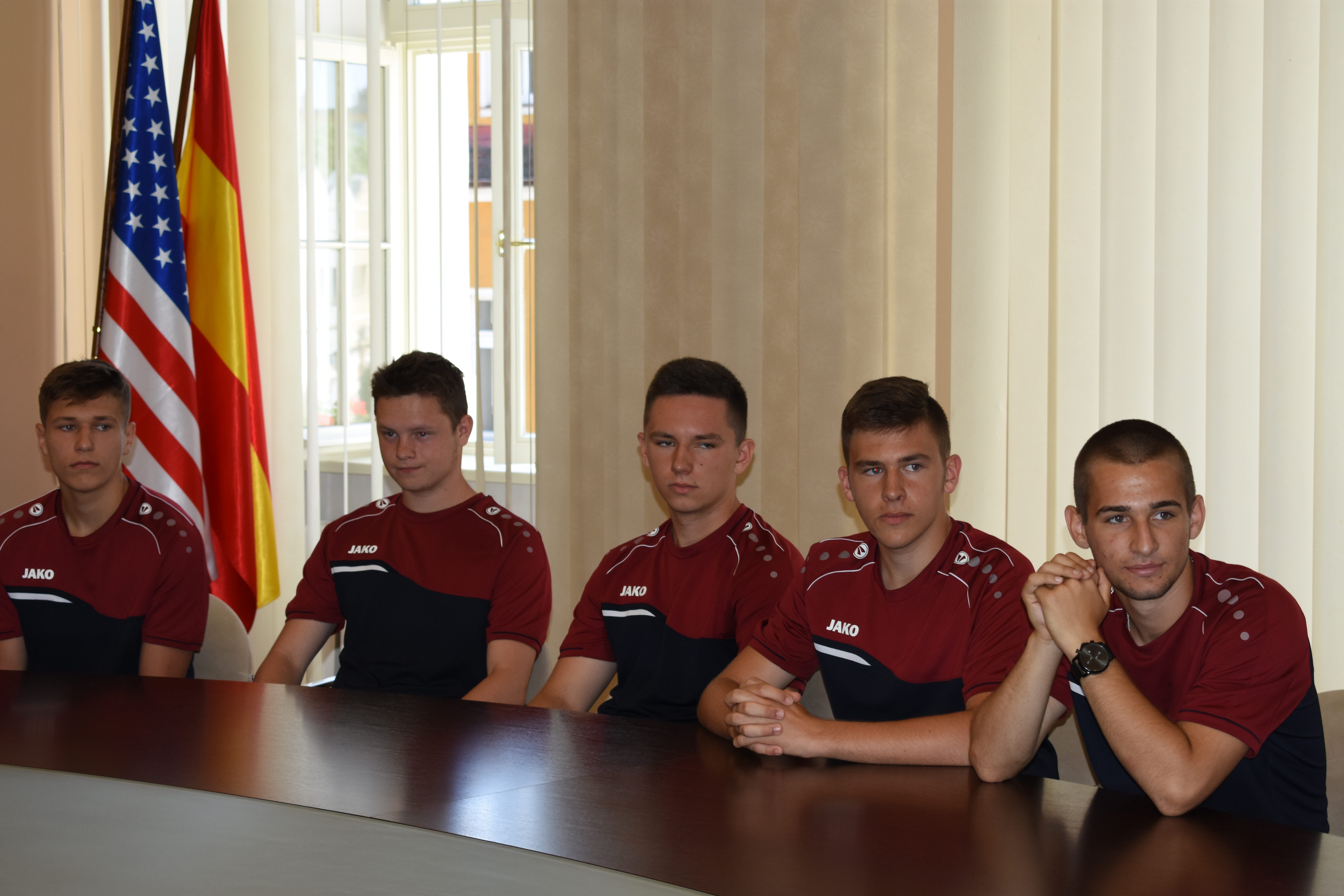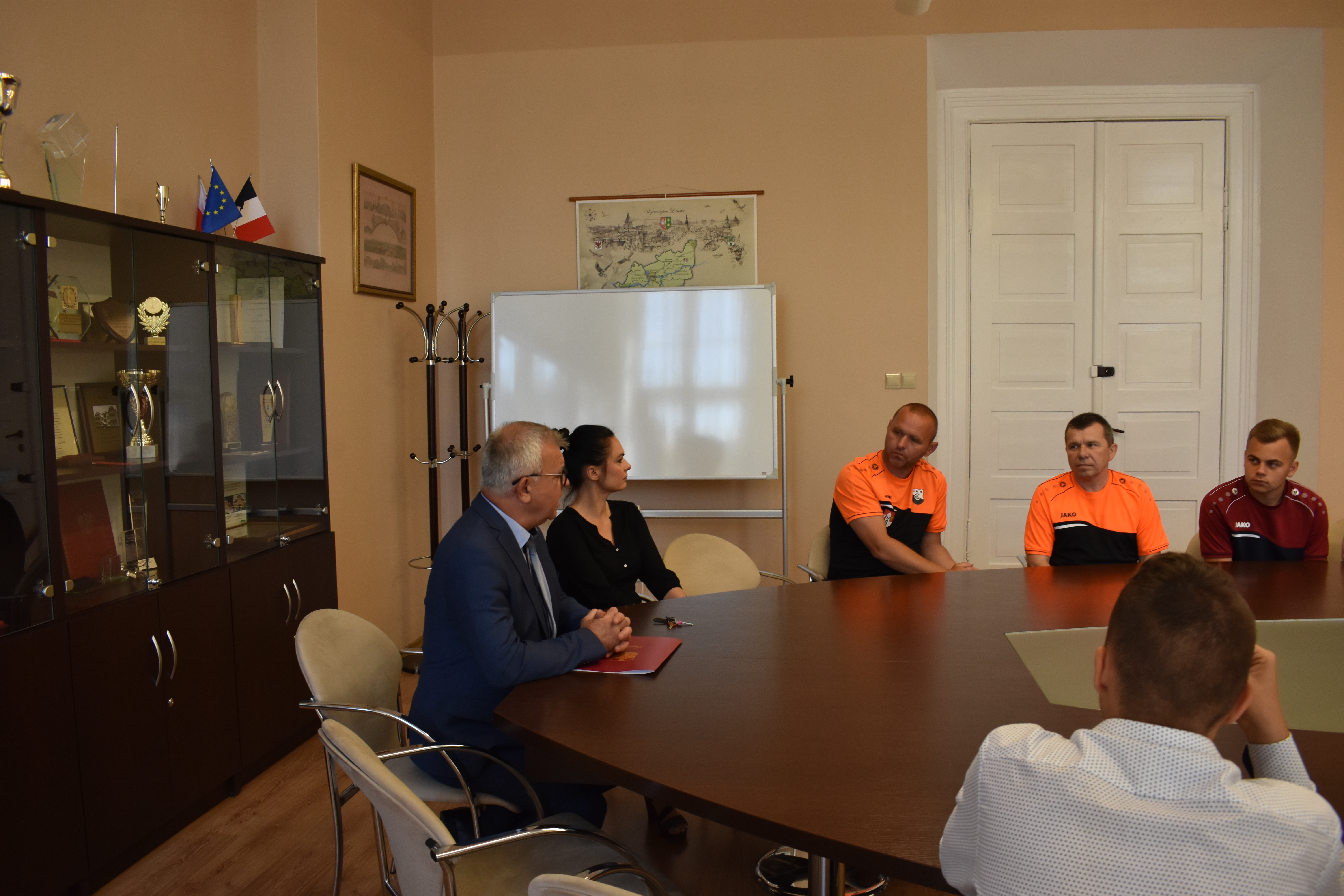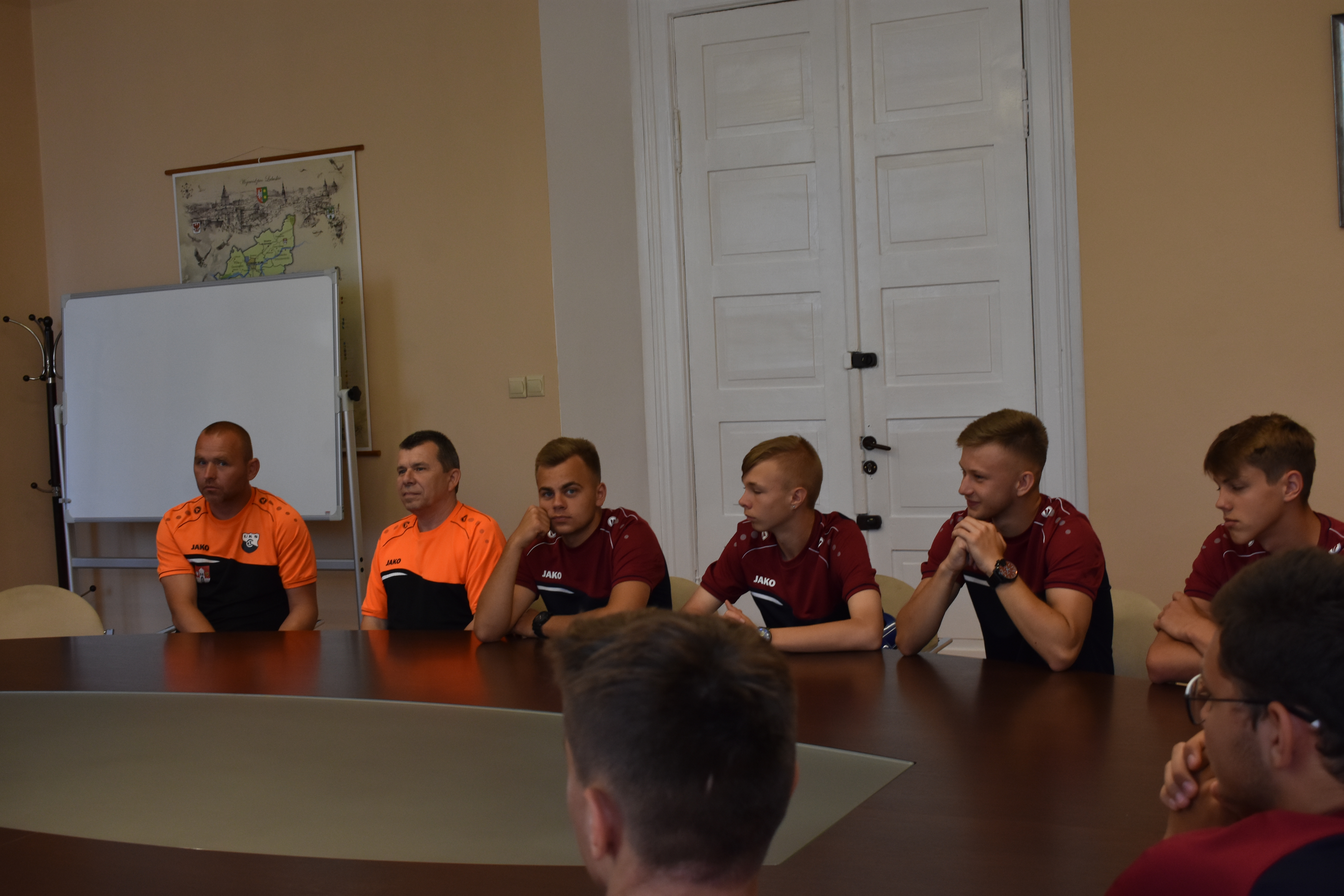 Dzisiaj nagrodziliśmy juniorską drużynę piłkarską UKS “Czarni” Żagań. Burmistrz Andrzej Katarzyniec pogratulował młodzieży zajęcia II miejsca w Wojewódzkiej Lidze Juniorów Starszych w Piłce Nożnej, pytając równocześnie o najtrudniejsze i najłatwiejsze mecze tych rozgrywek oraz ogólne wrażenia po zakończonym sezonie. Burmistrz zapewnił, że stadion przy ulicy Karpińskiego, na którym trenują młodzi zawodnicy, zostanie dofinansowany, co poprawi warunki prowadzenia szkoleń. Równocześnie Andrzej Katarzyniec poprosił młodych o pozostanie w barwach “Czarnych i dalszą grę dla Żagania. W podziękowaniu za osiągnięte wyniki przekazał wspólnie z Naczelnik Wydziału Kultury, Sportu i Promocji Kingą Komar, na ręce trenerów – Sebastiana Horodyskiego oraz Kazimierza Buca – czek do zrealizowania na potrzeby drużyny.