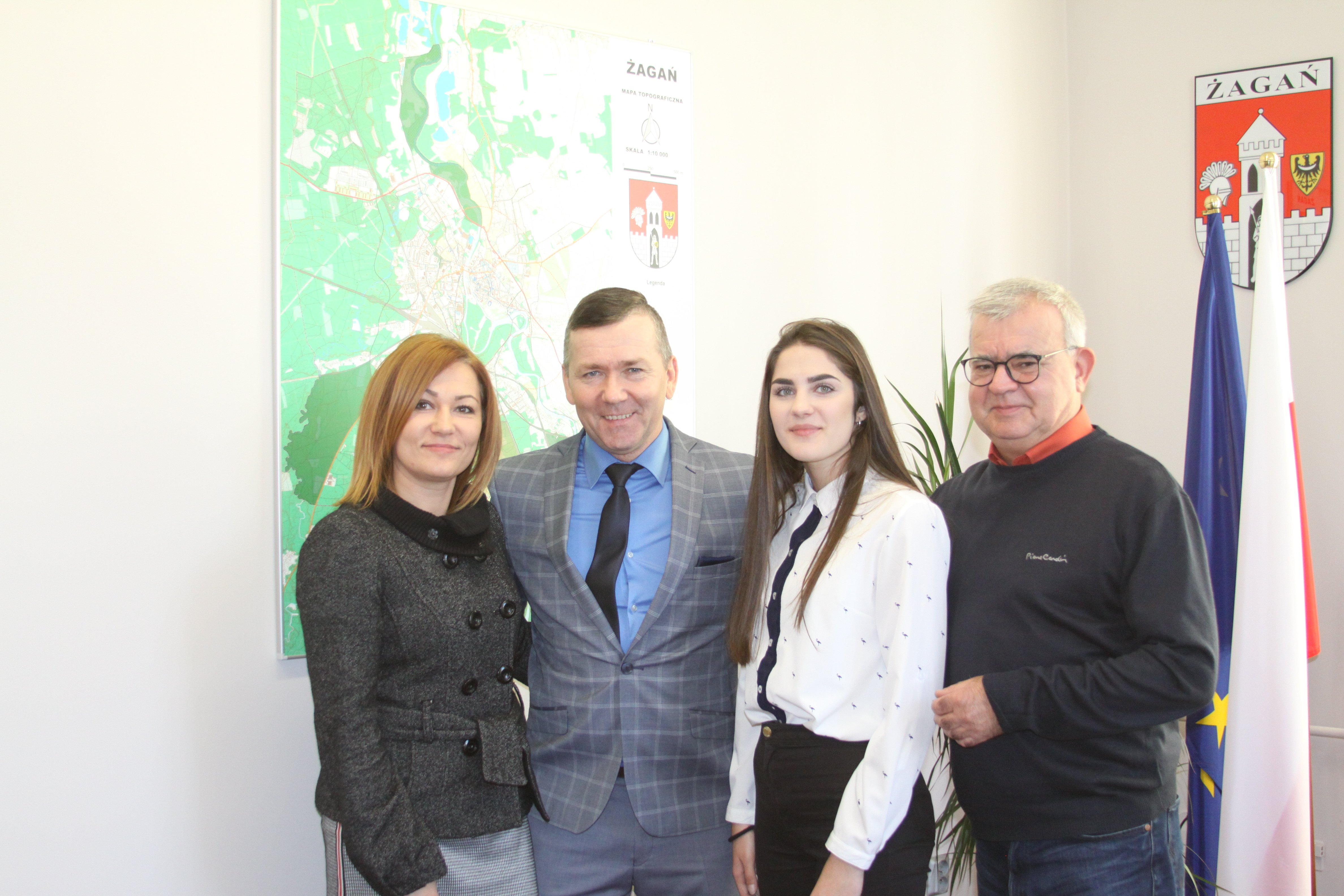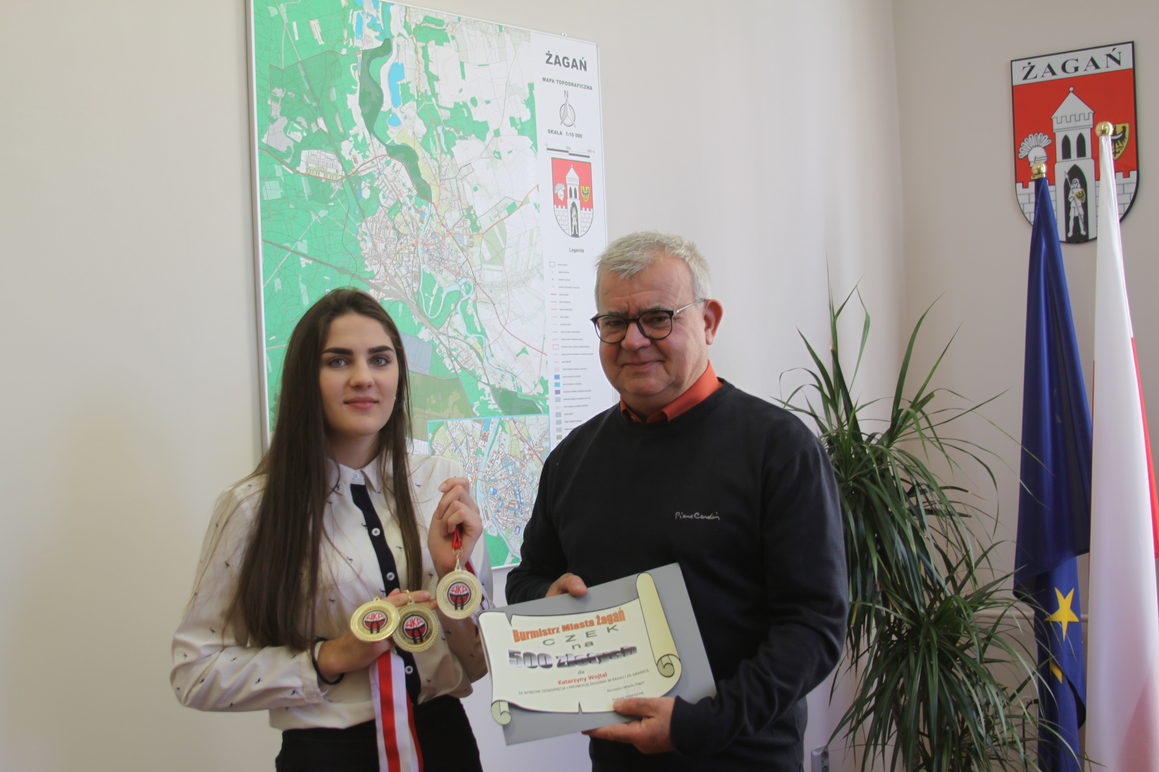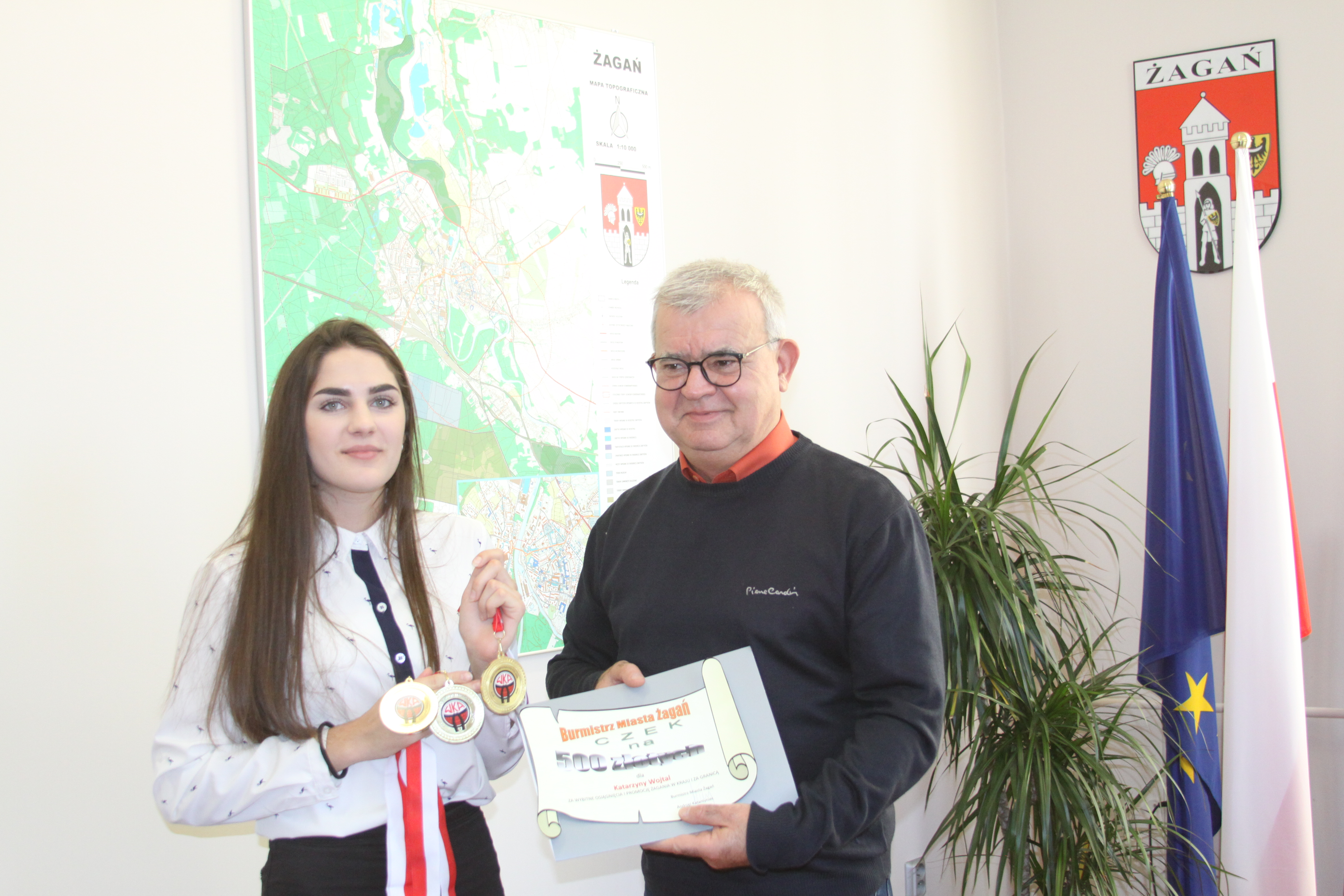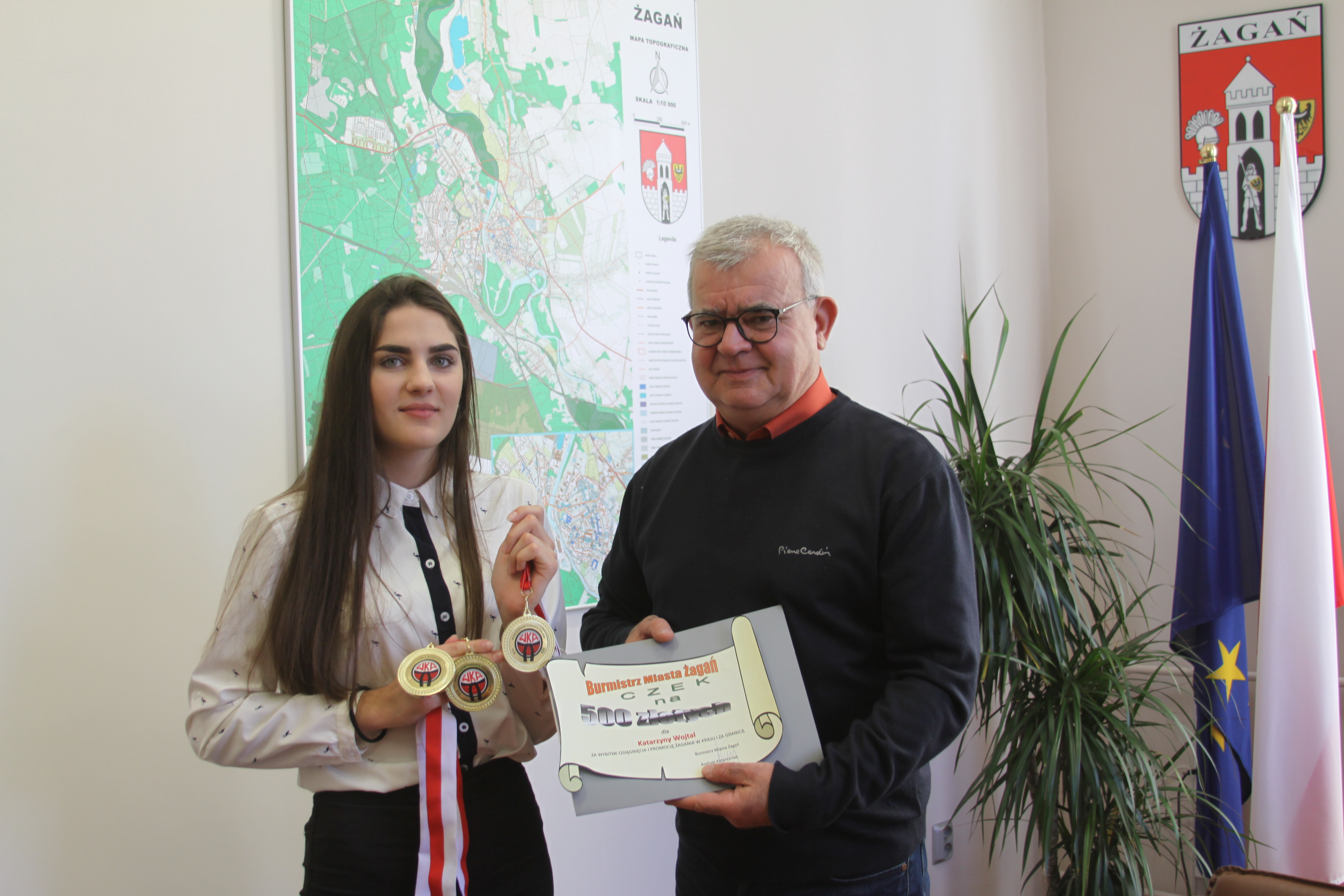 Na zaproszenie burmistrza Andrzeja Katarzyńca Urząd Miasta odwiedziła dzisiaj Mistrzyni Świata Katarzyna Wojtal wraz z mamą Panią Anetą Wojtal oraz trenerem Panem Arturem Niezgodą. Aby wesprzeć młodą zawodniczkę WKS “Sobieski” Żagań i podziękować za godne reprezentowanie naszego miasta na Mistrzostwach Świata, burmistrz przekazał jej symboliczny czek na zakup sprzętu sportowego.