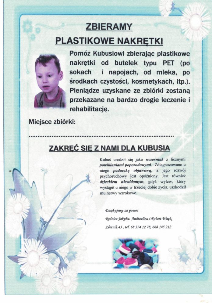 Osoby zainteresowane zbiórką nakrętek dla Kubusia zapraszamy do urzędu oraz zachęcamy do kontaktu z Małgorzatą Klorek – telefon 606781715. Istnieje możliwość zebrania nakrętek wśród znajomych i przekazanie ich opiekunom Kubusia.