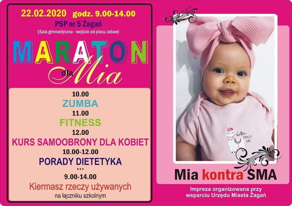 22 lutego 2020 roku odbędzie się Maraton dla Mii w Publicznej Szkole Podstawowej nr 5 w Żaganiu. Wystarczy wybrać jedną z zaproponowanych form aktywności, wpłacić 20 złotych i równie aktywnie wesprzeć zbiórkę. Organizatorzy przygotowali również kiermasz rzeczy używanych.