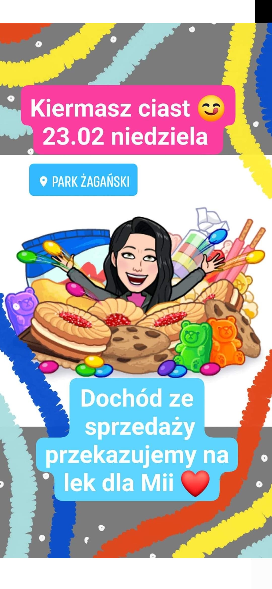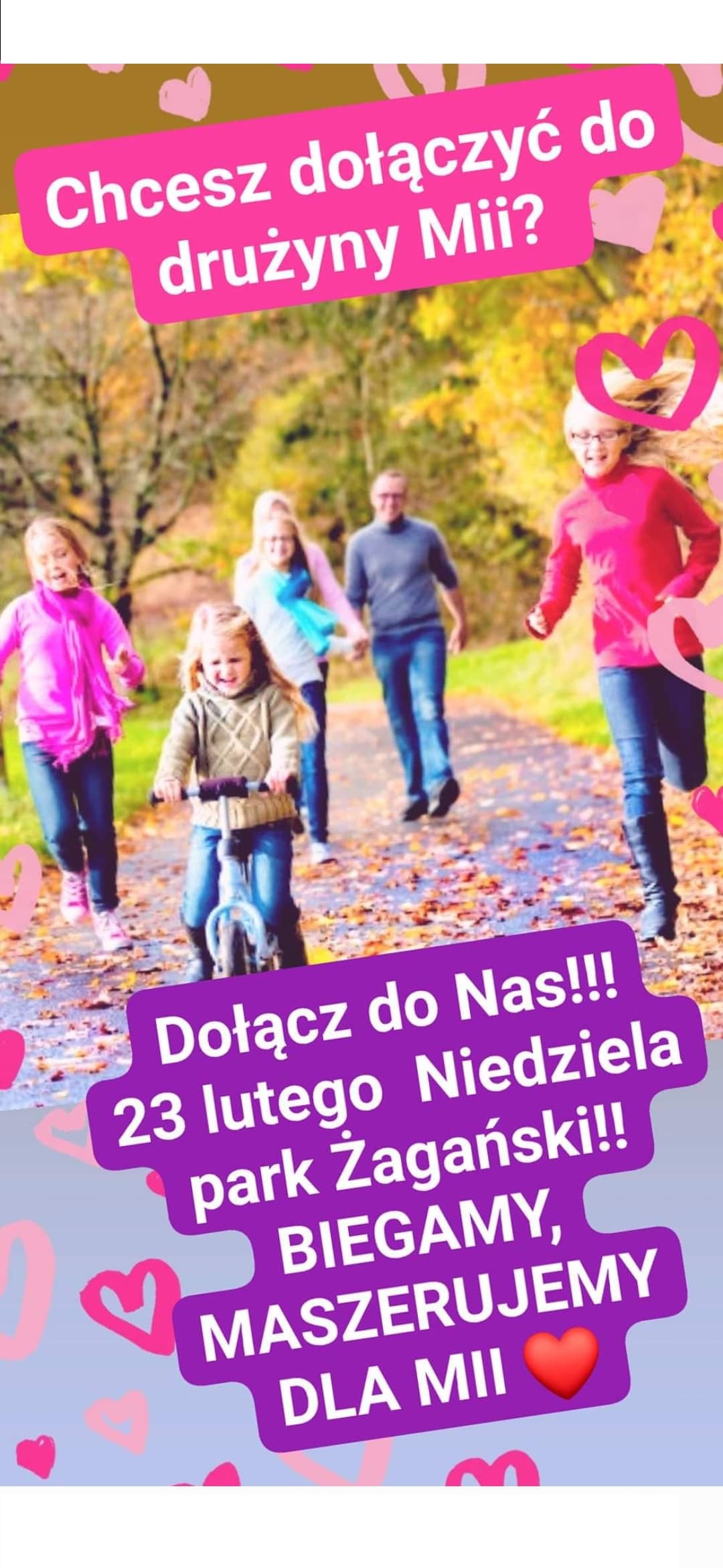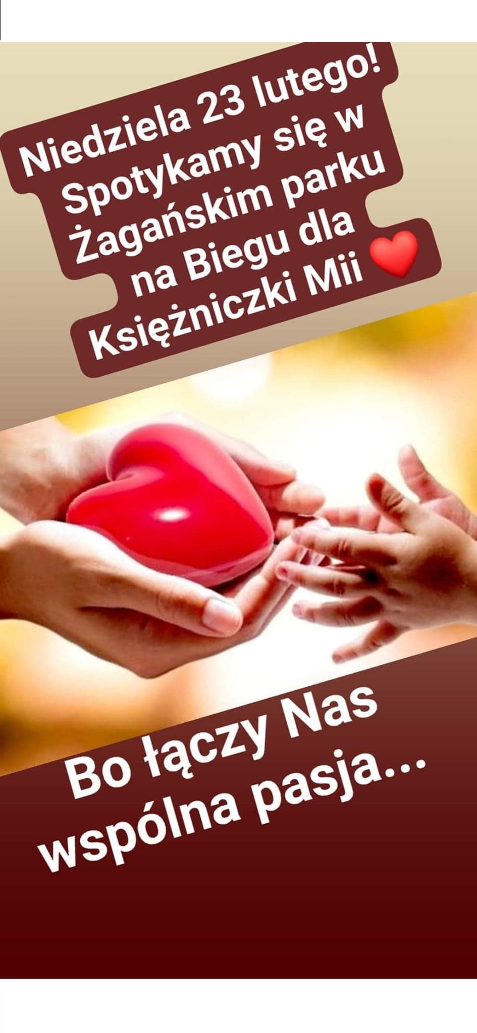 Żagańscy biegacze postanowili zorganizować “Bieg dla Księżniczki Mii”, który 23 lutego odbędzie się na terenie parku pałacowego. Przygotowano trzy trasy dla trzech grup biegaczy. Aby stanąć na starcie należy przekazać datek na leczenie Mii (wpisowe wyniesie 10 złotych dla dzieci i 30 złotych dla osoby dorosłej). W tym dniu odbędzie się również spacer nordic walking. Podczas wydarzenia będzie można uzupełnić spalone kalorie pysznym ciastem. Dochód ze sprzedaży słodkości również przekazany zostanie na pomoc dziewczynce.