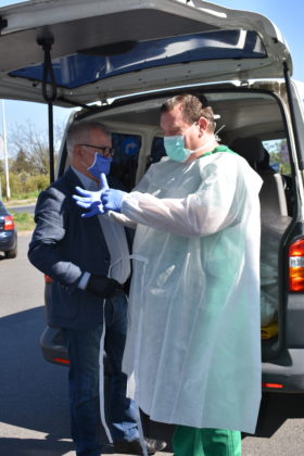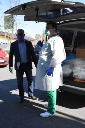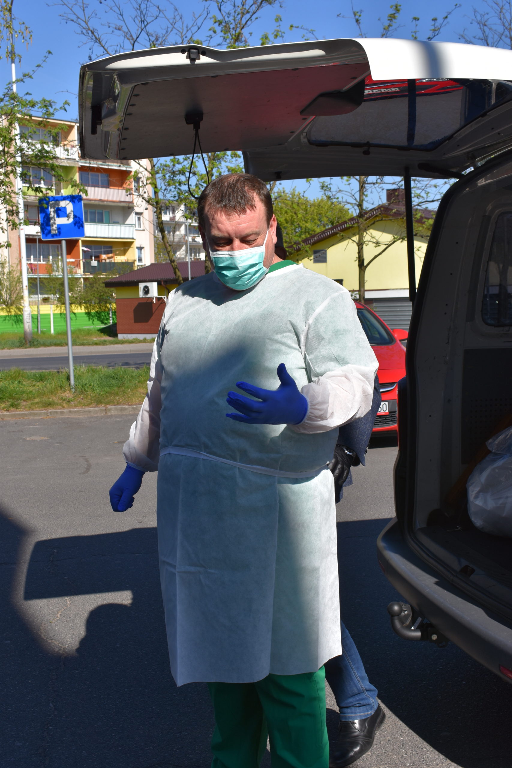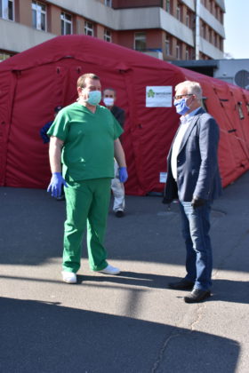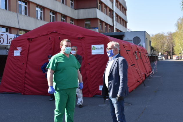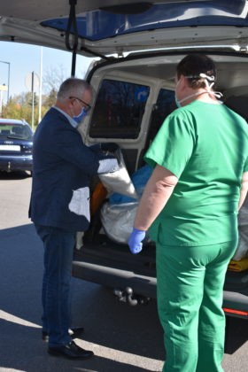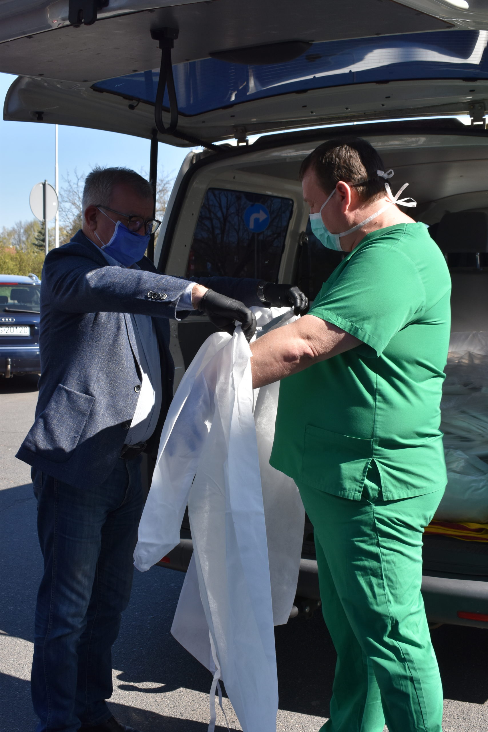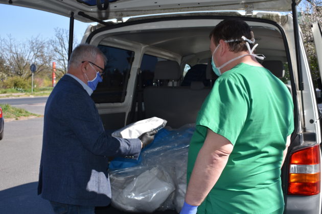 Burmistrz Andrzej Katarzyniec wspólnie z członkiem zarządu powiatu Mariuszem Krugłym przekazał kolejną partię materiałów ochronny indywidualnej żagańskiemu szpitalowi. Tym razem kolejne 900 maseczek oraz 450 fartuchów trafiło bezpośrednio do naszej filii 105. Kresowego Szpitala Wojskowego w Żarach. Pomagamy personelowi medycznemu, ponieważ ich bezpieczeństwo jest również gwarancją naszego zdrowia – podkreślił Andrzej Katarzyniec. – Wy teraz walczycie o nasze życie. Mamy obowiązek wspierać Was w tej wyjątkowej sytuacji. Lekarz Jacek Dworak, odbierając materiały przyznał, że to bardzo ważne wsparcie. Dziennie zużywane jest 200 sztuk fartuchów na potrzeby samego izolatorium.