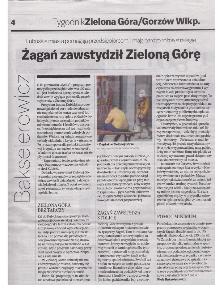 24 kwietnia 2020 roku na łamach Gazety Wyborczej dokonano zestawienia pakietów pomocy przedsiębiorcom oferowanych przez samorządy na terenie województwa lubuskiego. Wbrew tezom publikowanym przez prasę regionalną, program zaproponowany przez władze Żagania został oceniony wyżej niż ten, stworzony na przykład przez Zieloną Górę, Żary czy Świebodzin. Pakiet wsparcia skierowany do lokalnych przedsiębiorców dotyczy bowiem wielu obszarów działalności gospodarczej. Zastosowane ulgi oraz odroczenia dopasowane są do możliwości gminy, co zostało dostrzeżone w artykule.