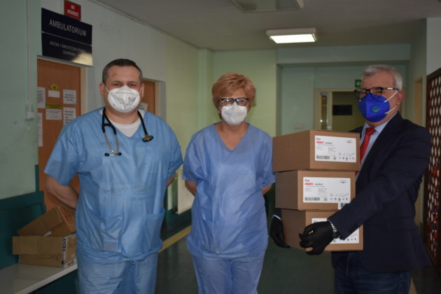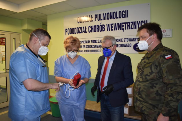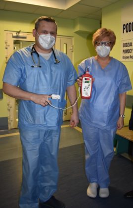 Burmistrz Andrzej Katarzyniec przekazał dzisiaj 3 nowoczesne pulsoksymetry stacjonarno-transportowe na potrzeby oddziału covidowego w Żaganiu. Urządzenia są niezbędne do monitorowania właściwego stanu pacjentów z problemami oddechowymi, których niestety ciągle przybywa na terenie naszej placówki. Pulsoksymetry o wartości 9879 złotych żagański magistrat zakupił, uwzględniając wniosek komendanta 105. Kresowego Szpitala Wojskowego w Żaganiu, płk lek. med. Artura Lipczyńskiego. Jak podkreślił kierownik oddziału pulmonologicznego Damian Hyla urządzenia są bardzo dokładne i precyzyjne, co pozwoli na lepszą ocenę stanu zdrowia pacjentów covidowych. Nasz oddział posiada tylko jeden tego typu pulsoksymetr.