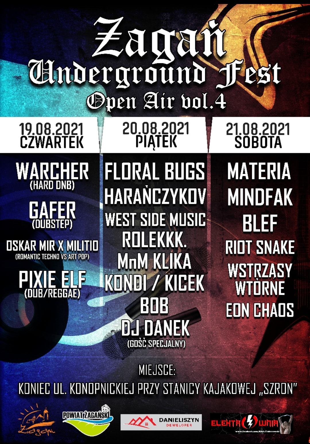 Fanów mocnego brzmienia ucieszy fakt, że już jutro (19.08) o godz. 17.00 przy stanicy kajakowej wystartuje cykl koncertów w ramach Żagań Underground Fest. To już czwarta edycja festiwalu. W pierwszy dzień będziemy bawić się w rytm muzyki elektronicznej – zagra dla Was Warcher, Gafer, Oskar Mir X Militio i Pixie Elf. W piątkowy wieczór będzie królował rap. Na żagańskiej scenie zagoszczą: Floral Bugs, Harańczykov, West Side Music, Rolekkk., MnM Klika, Kondi/Kicek, Bob i gość specjalny Dj Danek. Festiwal zakończy się w sobotę solidnym rockowym brzmieniem. Wystąpią: Materia, Mindfak, Blef, Riot Snake, Wstrząsy wtórne oraz Eon Chaos.