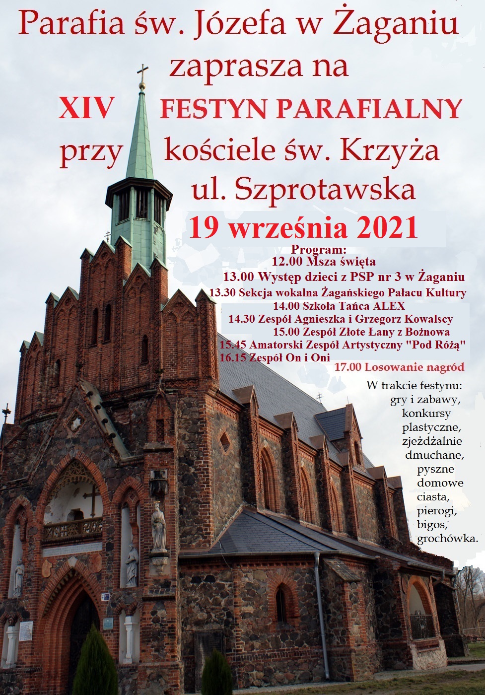 Parafia św. Józefa zaprasza na XIV Festyn Parafialny przy Kościele św. Krzyża, który odbędzie się w najbliższą niedzielę 19 września. W programie występy lokalnych zespołów, gry i zabawy dla najmłodszych, dmuchańce, domowe wypieki, bigos i grochówka.