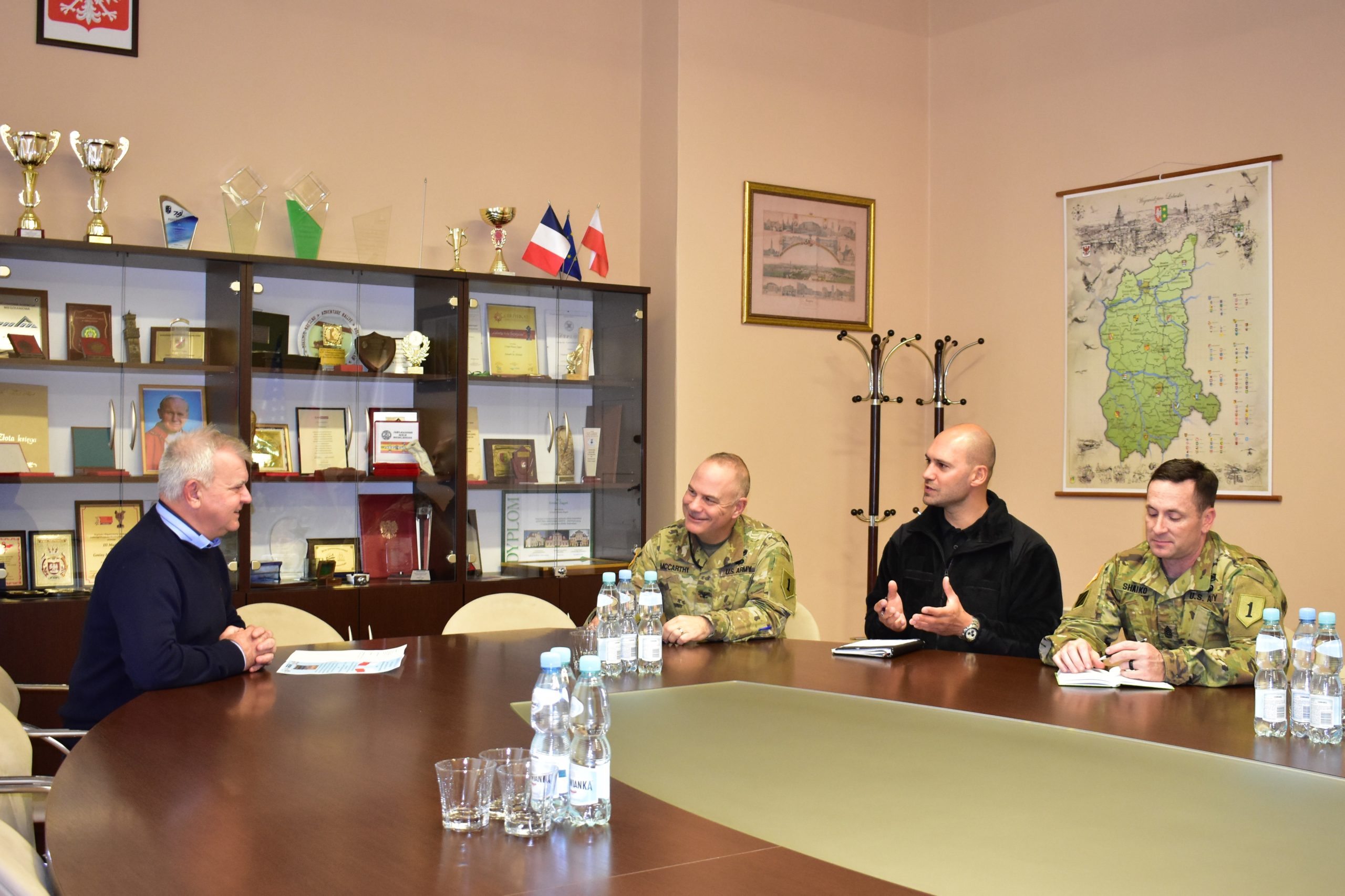 Pułkownik Brian McCarthy, dowódca kolejnej zmiany żołnierzy amerykańskich w Żaganiu, wspólnie ze swoimi współpracownikami odwiedził magistrat, aby omówić możliwości współpracy z miastem. Burmistrz Andrzej Katarzyniec zaprosił gości przede wszystkim do udziału w uroczystościach planowanych w związku z Narodowym Świętem Niepodległości, przedstawiając szczegóły harmonogram wydarzeń planowanych na 11 listopada 2021 roku. Burmistrz zaprosił również żołnierzy amerykańskich na Jarmark Bożonarodzeniowy (17-19 grudnia) oraz na pokaz sztucznych ogni, który tradycyjnie odbędzie się w noc sylwestrową. Nasi goście podkreślali, że Żagań jest piękny, a ludzie serdeczni. Andrzej Katarzyniec opowiadał o polskich tradycjach świątecznych, zachęcając do spróbowania potraw, jakie będą serwowane w trakcie Wigilii Miejskiej. Dodatkowo uspokoił gości, zapewniając że zimy w Polsce są obecnie znacznie słabsze niż przed laty. Wszyscy liczymy jednak na odrobinę śniegu przed końcem roku – skwitował pytania o szansę na białą zimę burmistrz.